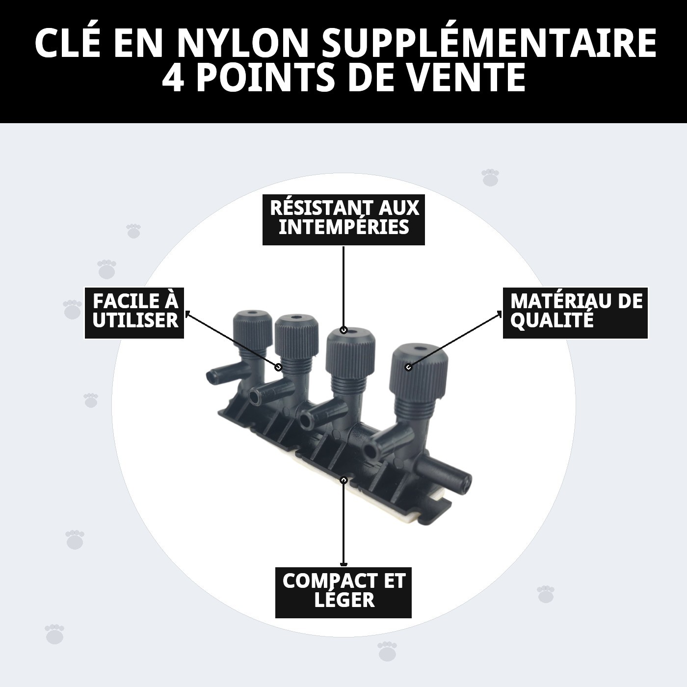 La clé en nylon extra 4 sorties est fabriquée avec des matériaux de haute qualité, ce qui la rend résistante et durable. De plus, son design ergonomique garantit qu'elle peut être manipulée facilement, même si vous emmenez vos animaux en même temps. Voici quelques-unes de ses caractéristiques les plus pertinentes :