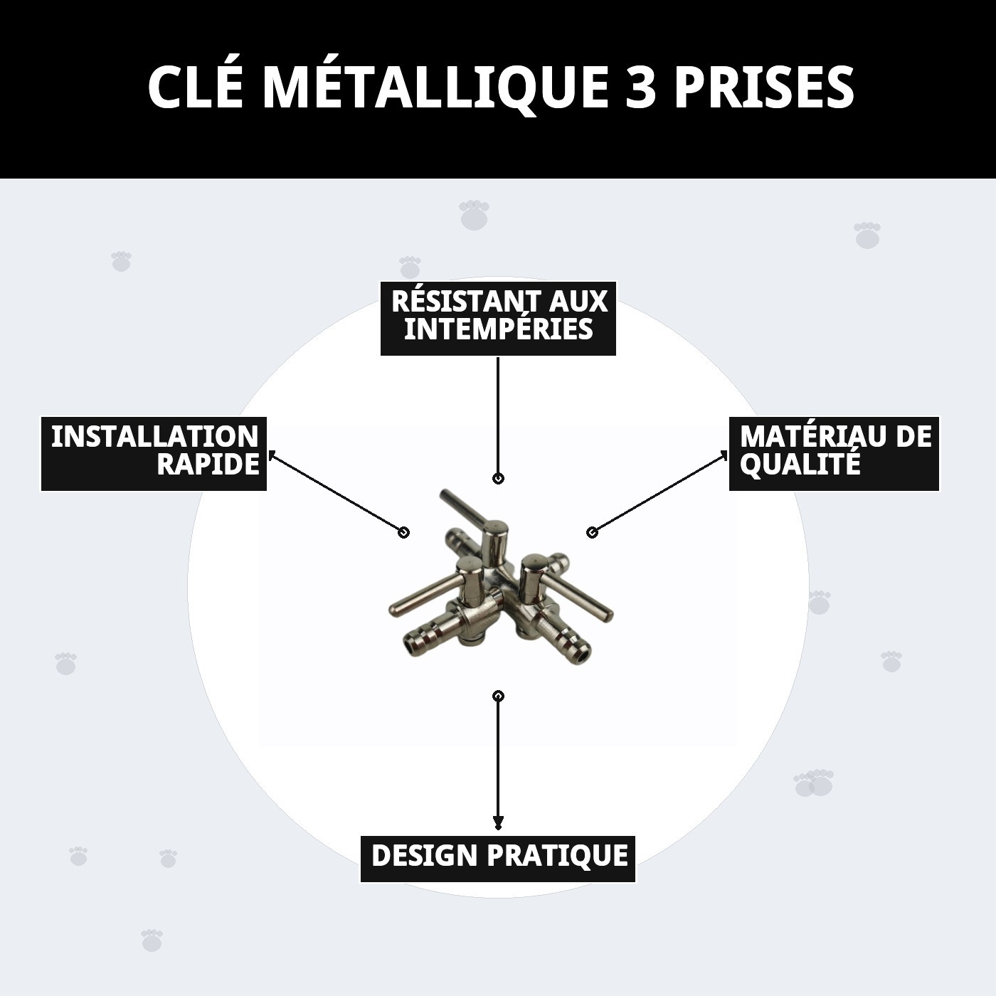 La clé métallique 3 sorties est la solution parfaite pour faciliter l'accès à vos animaux de compagnie. Avec son design robuste et fonctionnel, elle permet de connecter jusqu'à trois tuyaux ou accessoires à la fois, optimisant l'espace et évitant les enchevêtrements. Idéale pour tout amoureux des animaux à la recherche de confort et d'efficacité dans le soin de leurs compagnons à quatre pattes.
