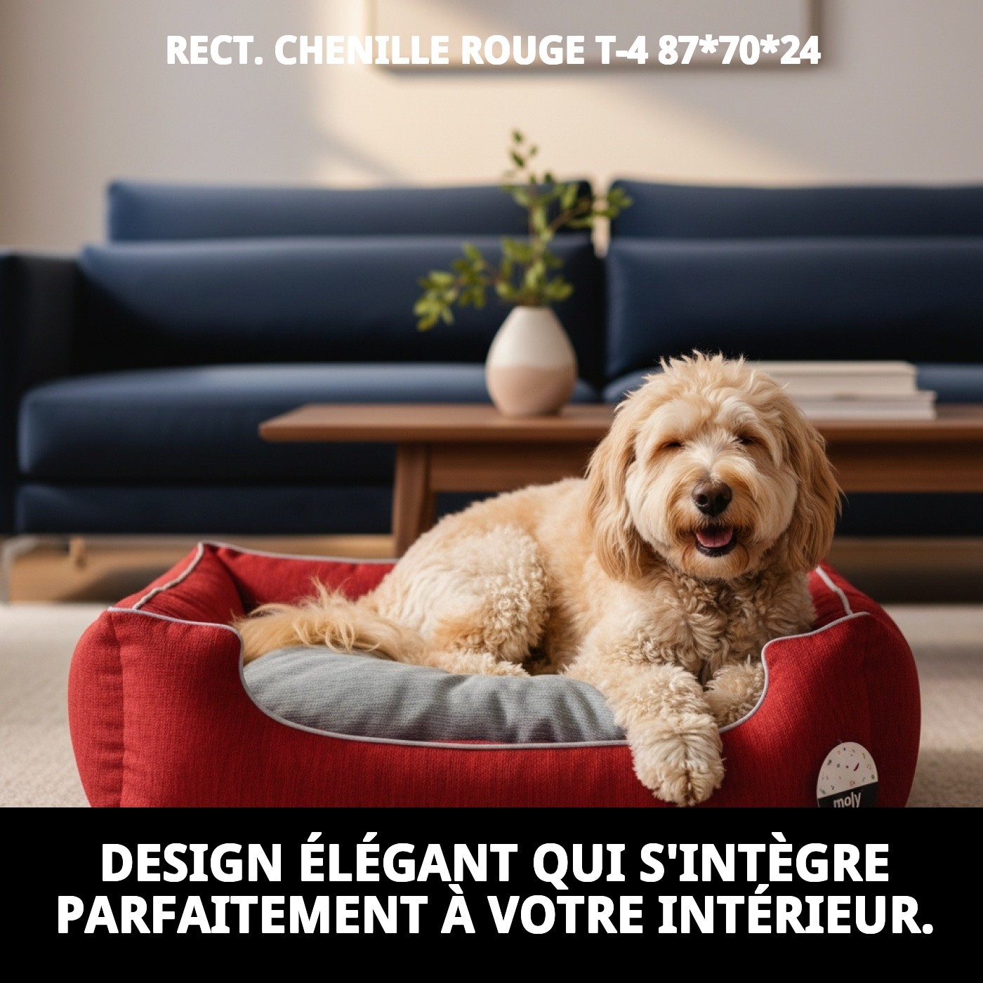 La couche rectangulaire en chenille rouge T-4 de Moly est idéale pour votre animal de compagnie. Son design élégant et confortable est fabriqué avec un tissu résistant et lavable, parfait pour maintenir une hygiène optimale. Le coussin anti-acariens assure un confort maximal, permettant à vos petits amis de profiter de douces nuits.