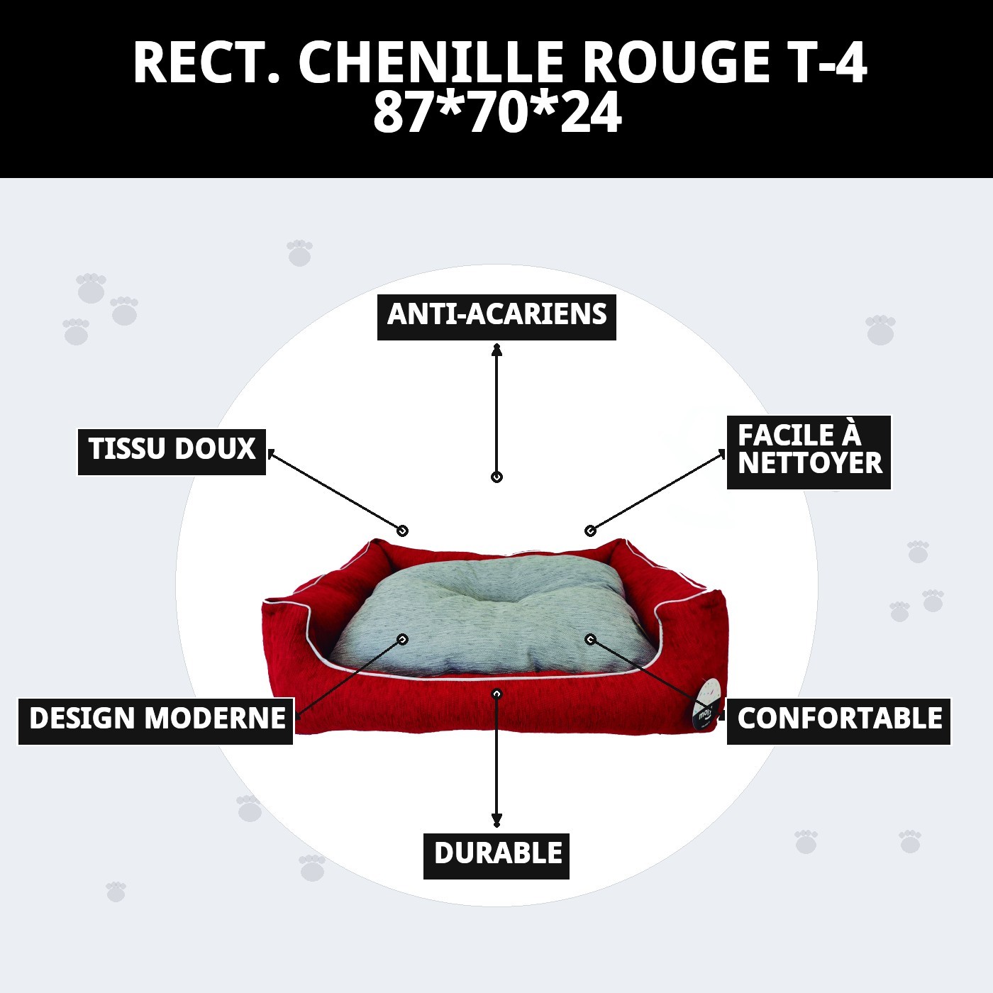 Alors, si vous voulez que votre compagnon à fourrure profite d'un repos réparateur et confortable, n'hésitez pas à envisager le lit rectangulaire en chenille rouge T-4. Votre animal vous remerciera à chaque sieste et chaque sommeil paisible. Faites de son espace un endroit aussi spécial qu'il le mérite !