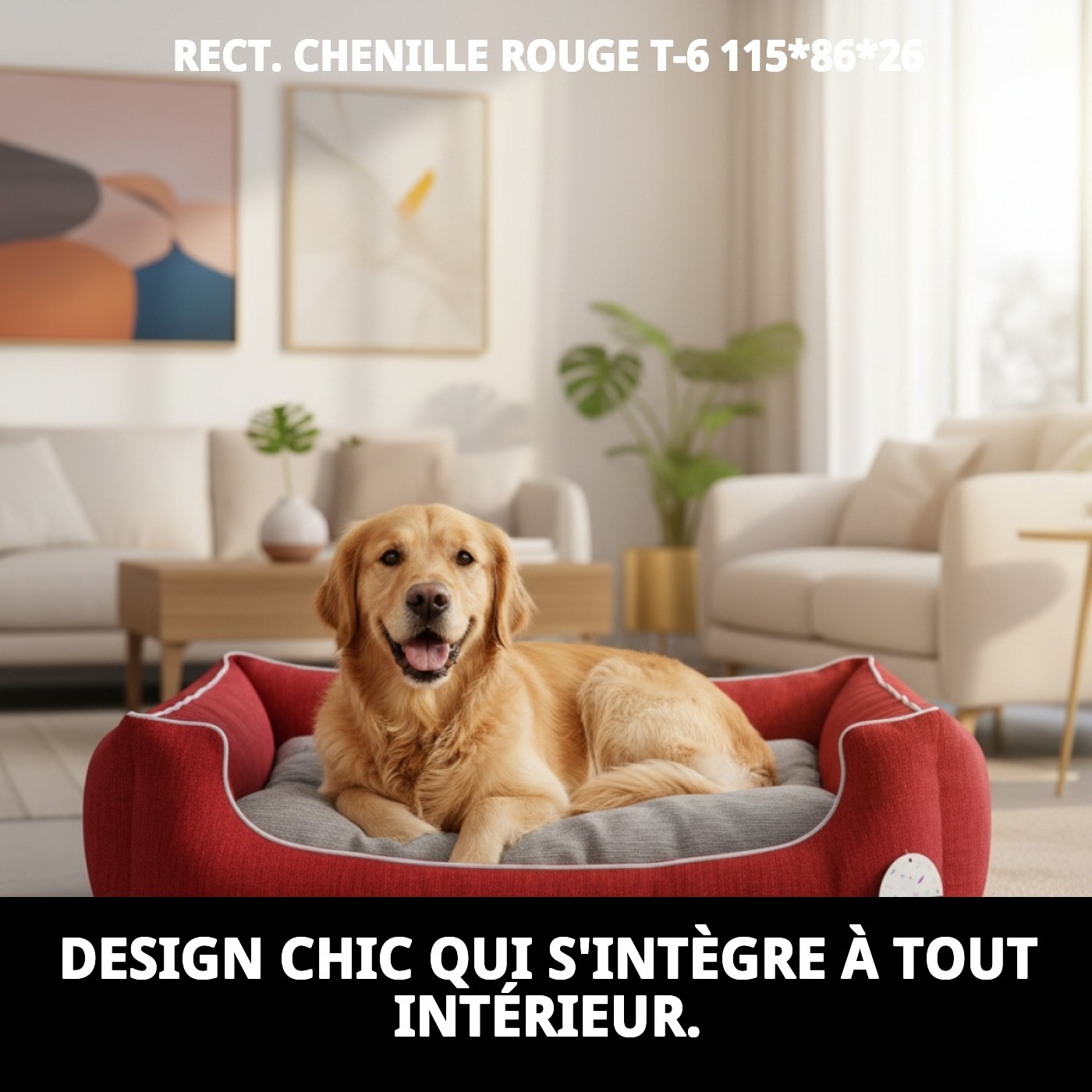 Le lit rectangulaire en chenille rouge T-6 115*86*26 n'est pas seulement un endroit de repos, mais il s'adapte également à votre maison et à vos besoins. Que ce soit dans un coin du salon, à côté de votre lit ou sur la terrasse, ce lit devient un complément parfait. N'est-ce pas génial de pouvoir offrir un espace aussi beau et confortable à votre meilleur ami ?