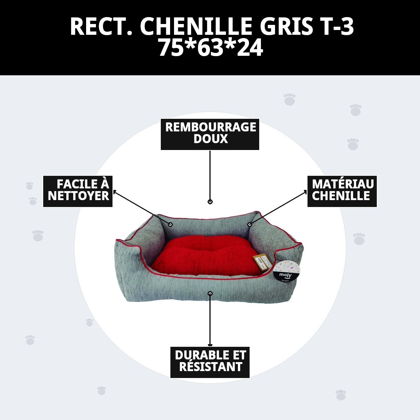 Le lit rectangulaire en chenille gris T-3 75*63*24 est l'endroit idéal pour que votre animal de compagnie se repose avec style. Son design en chenille gris et rouge, associé à un rembourrage anti-acariens, garantit confort et sécurité. Offrez à votre compagnon à fourrure un espace accueillant et élégant où il pourra se détendre et rêver.
