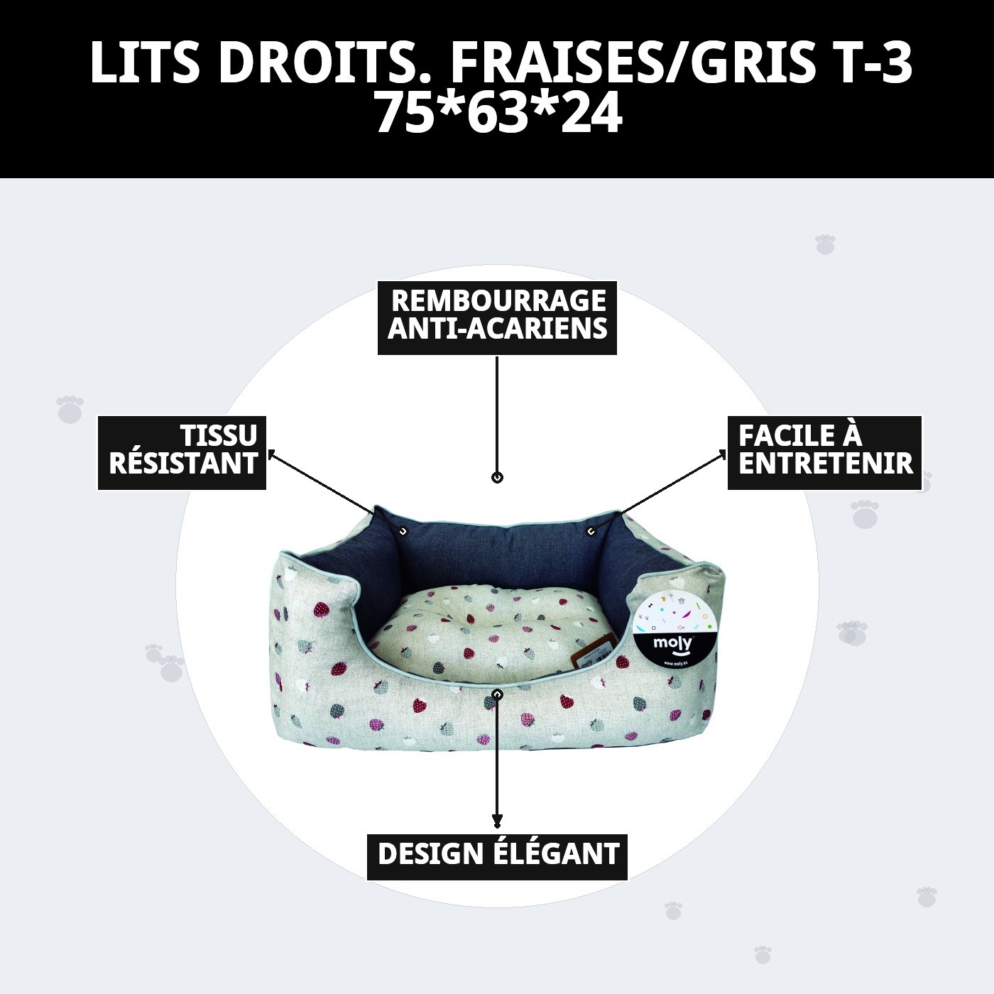 Si quelque chose que tous les propriétaires d'animaux veulent, c'est que nos compagnons à quatre pattes aient un endroit confortable et accueillant pour se reposer. Le lit rect. fraises/gris T-3 75*63*24 est l'option parfaite pour cela. Avec son design charmant, qui combine des fraises avec une élégante toile grise, ce lit n'est pas seulement joli, mais il est également conçu pour offrir le maximum de confort à votre animal.