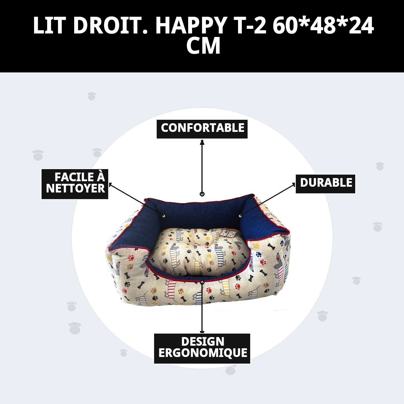 Le lit Happy T-2 est fabriqué avec des matériaux de haute qualité, garantissant sa durabilité et sa résistance. Le tissu est doux au toucher et, en même temps, facile à nettoyer. J'ai eu des expériences précédentes avec des lits qui, après quelques mois, semblaient usés et sales, mais ce lit reste en parfait état, même après de multiples lavages. Cet aspect est fondamental pour maintenir un environnement hygiénique pour votre animal.