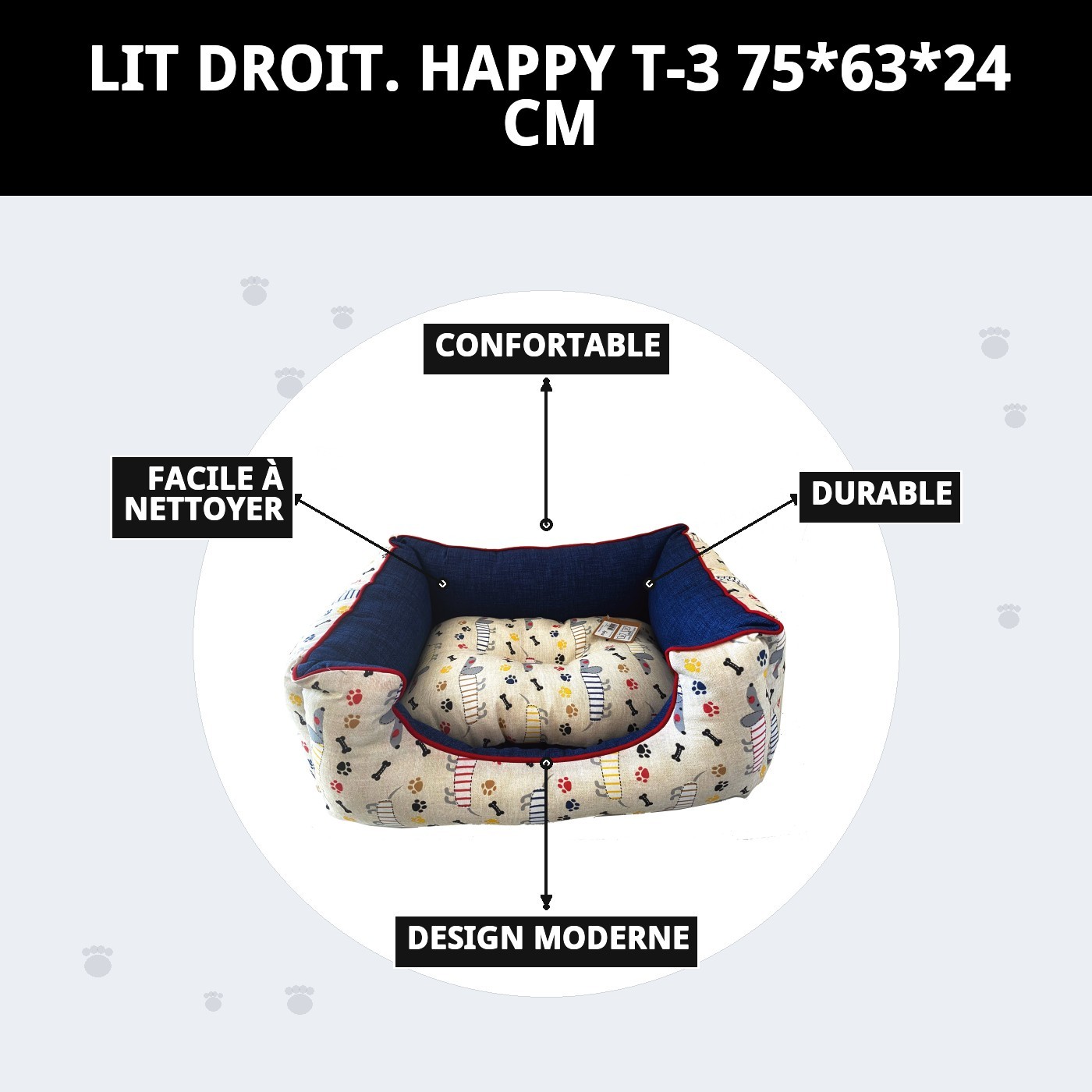 Si un endroit que tous les animaux à fourrure méritent à la maison, c'est sans aucun doute leur propre lit. Le lit rect. Happy T-3 75*63*24 cm est l'option parfaite pour que votre animal ait un espace confortable et accueillant. Avez-vous déjà vu votre chien ou votre chat chercher l'endroit idéal pour se reposer ? Avec ce lit, il n'aura plus à faire des acrobaties pour trouver le bon endroit. Voici plus d'informations sur ce merveilleux produit !