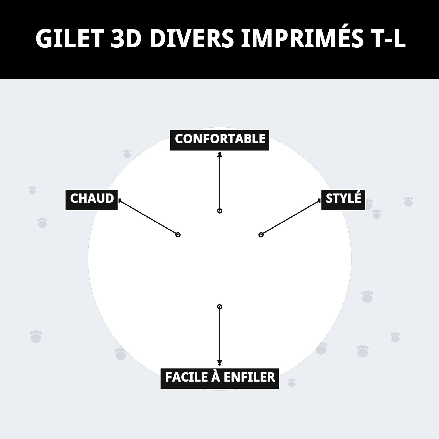 Le gilet 3D plusieurs imprimés T-L est parfait pour garder votre animal de compagnie au chaud et à la mode. Avec son design attrayant et confortable, il s'adapte à diverses occasions, que ce soit une promenade ou une réunion entre amis. Offrez à votre compagnon à quatre pattes le style qu'il mérite avec ce gilet unique.