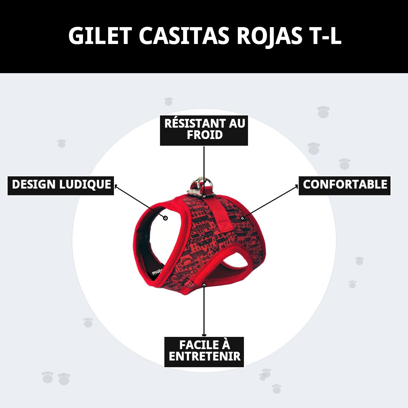 Alors n'hésitez plus et procurez-vous le gilet maisons rouges T-L. Votre chien vous remerciera avec chaque saut de joie qu'il fera lors de ses promenades.