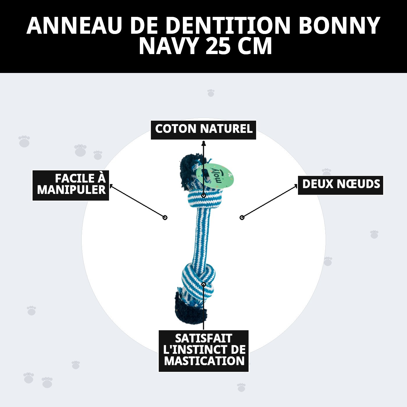 Le jouet à mâcher Bonn Navy 25 cm est l'accessoire parfait pour votre chiot, favorisant sa formation dentaire et le développement de sa mâchoire. Avec ses deux nœuds aux extrémités, il satisfait son instinct de mordre tout en permettant au coton naturel de garder ses dents propres et saines. Amusement et santé réunis en un seul produit !