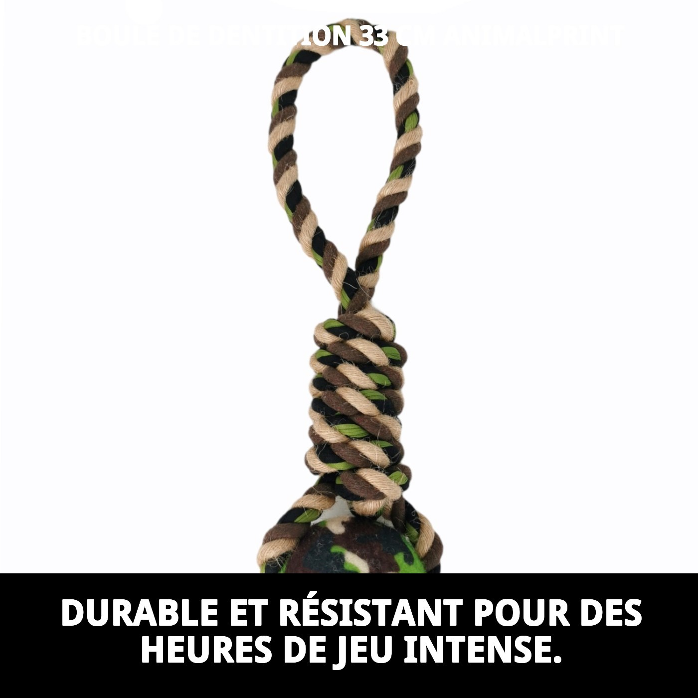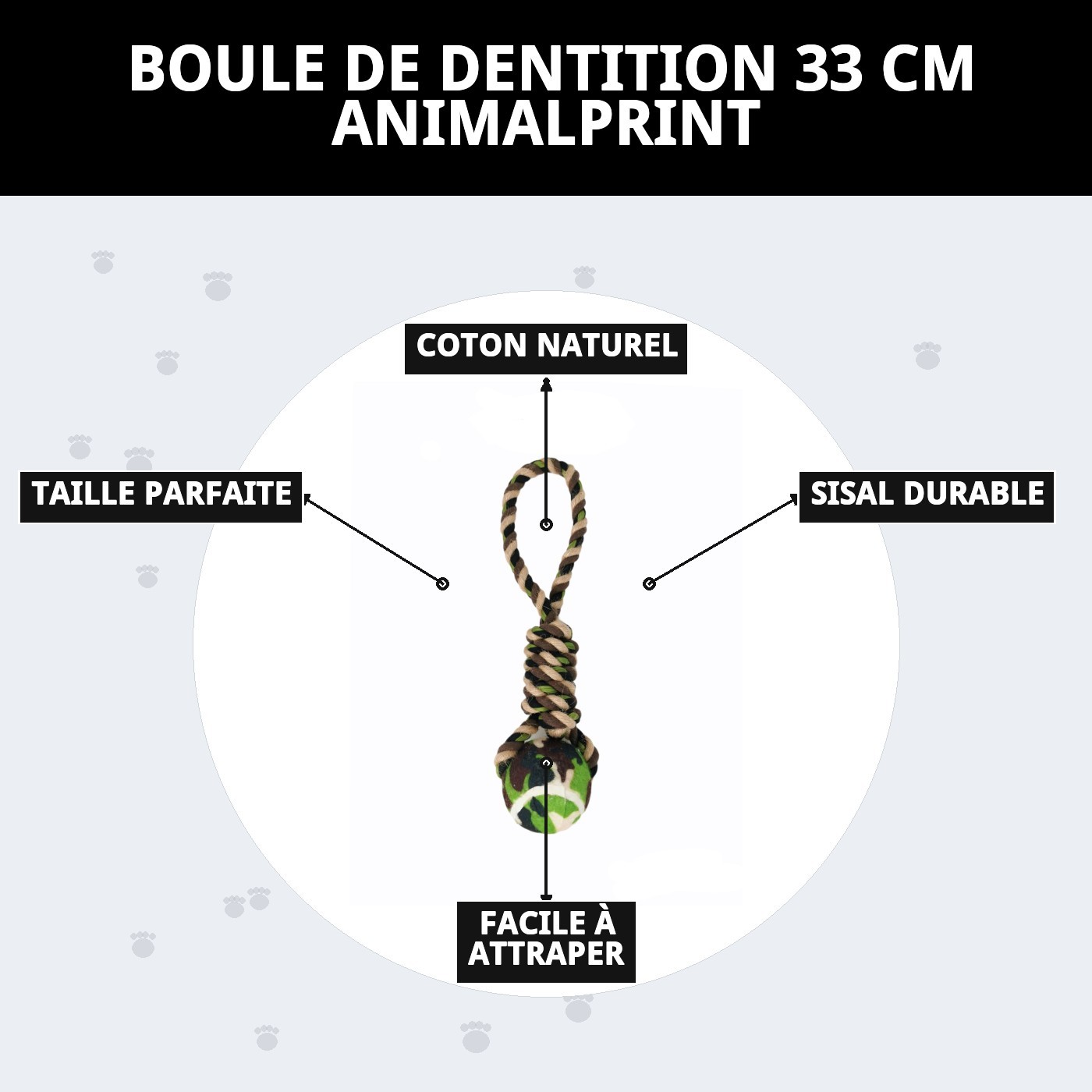 Offrez à votre compagnon à quatre pattes le mordeur balle 33 cm animalprint, le jouet parfait pour allier plaisir et santé dentaire. Fabriqué en coton 100% naturel et sisal, il garantit des moments de jeu inoubliables tout en prenant soin de ses dents. Ne laissez pas passer l'occasion de faire plaisir à votre chien avec ce jouet qui allie durabilité et fun !