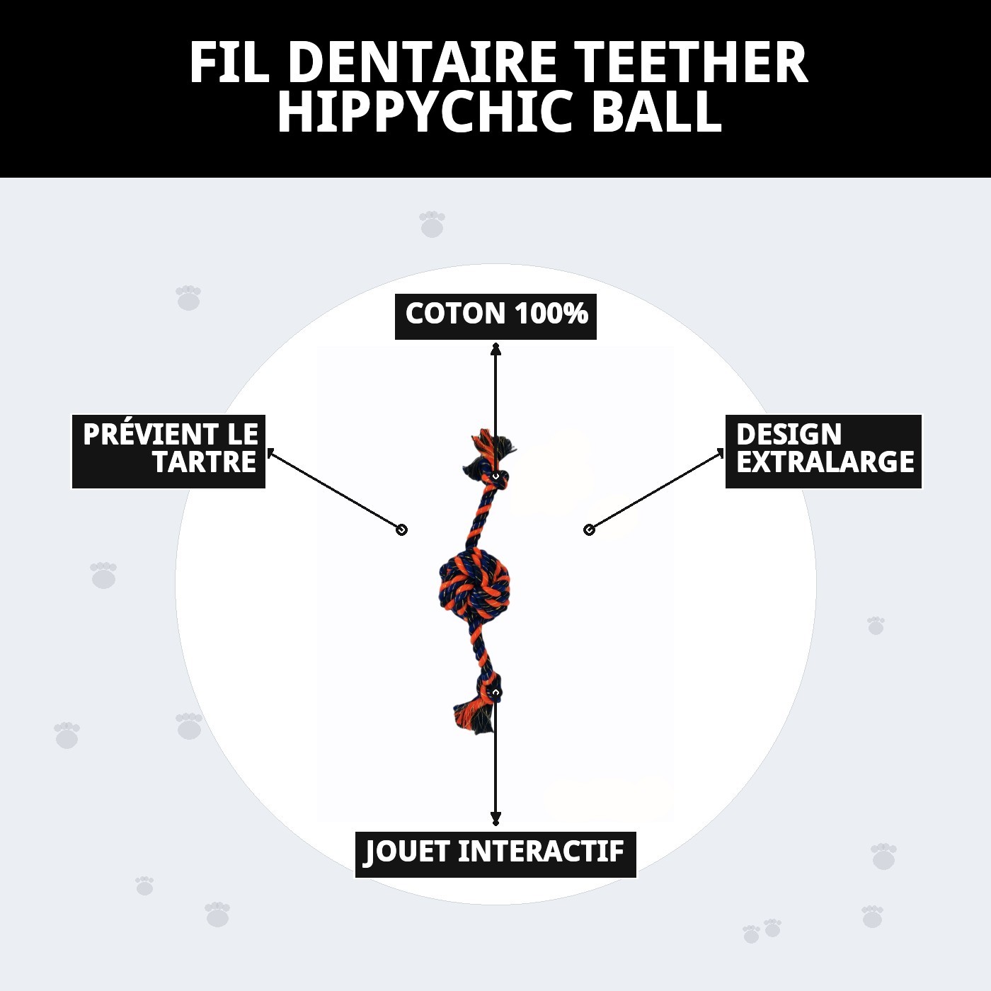 Le jouet à mâcher en forme de balle HippyChic est l'accessoire parfait pour votre chien. Fabriqué en 100% coton, il offre non seulement des heures de divertissement, mais contribue également à la santé bucco-dentaire en prévenant le tartre. Avec sa taille extra-large de 34 cm et ses nœuds aux extrémités, il est idéal pour jouer et mordre. Offrez à votre compagnon à quatre pattes un moment de bonheur tout en prenant soin de son hygiène dentaire !