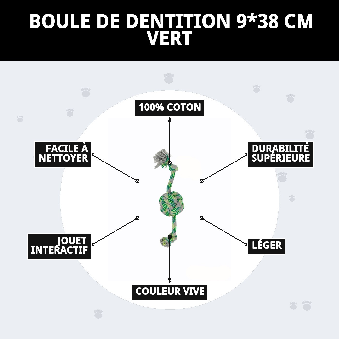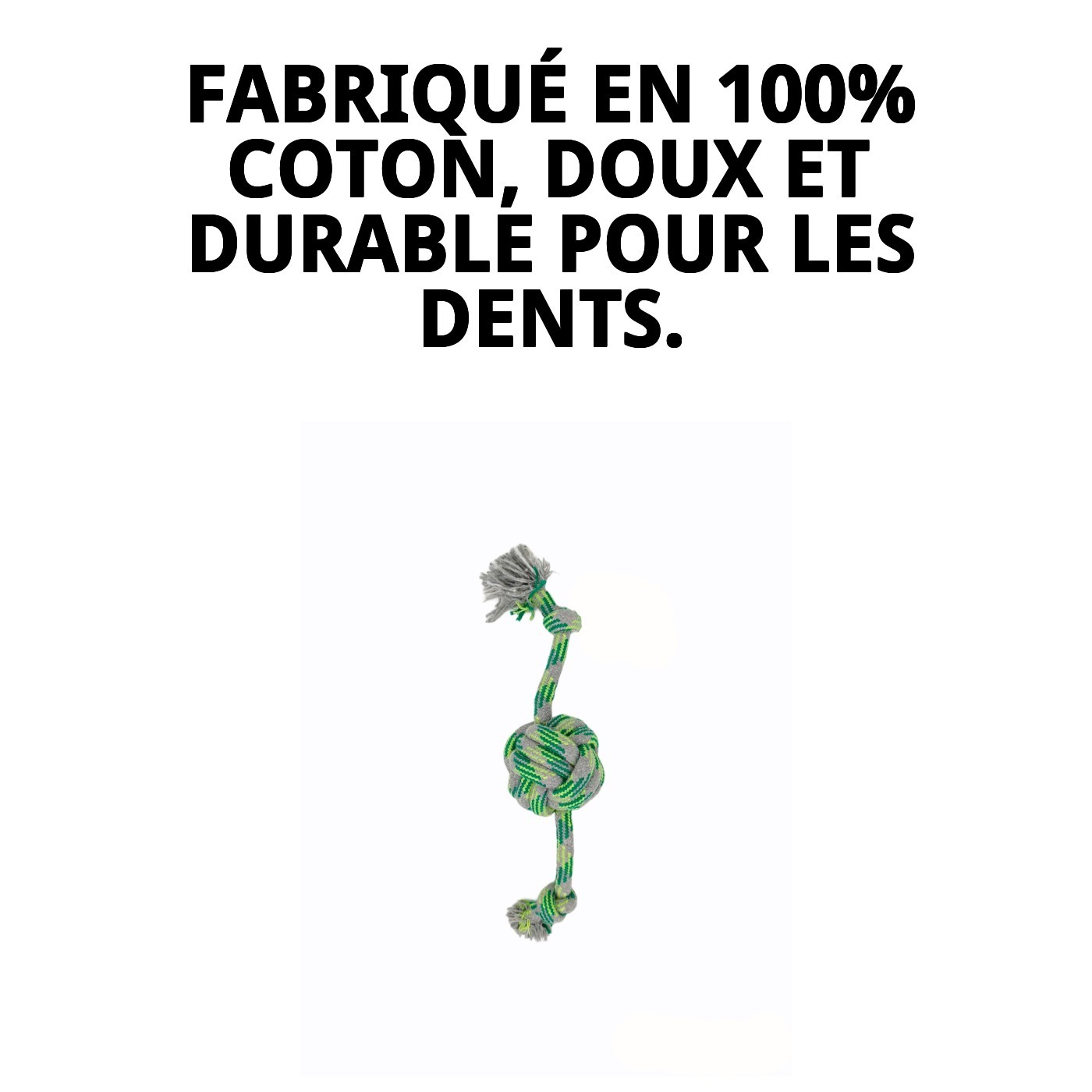 Une des caractéristiques les plus remarquables de ce jouet est qu'il est fabriqué en 100% coton, ce qui en fait une option sûre et durable. La corde avec nœuds est parfaite pour jouer, tirer et lutter avec votre chien, favorisant ainsi l'hygiène dentaire pendant le jeu. En mordant la corde, les dents de votre animal se nettoient, ce qui prévient les problèmes dentaires futurs.