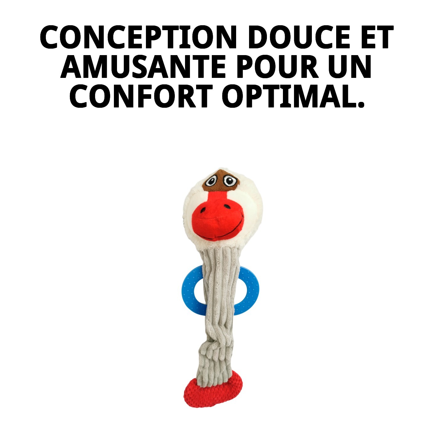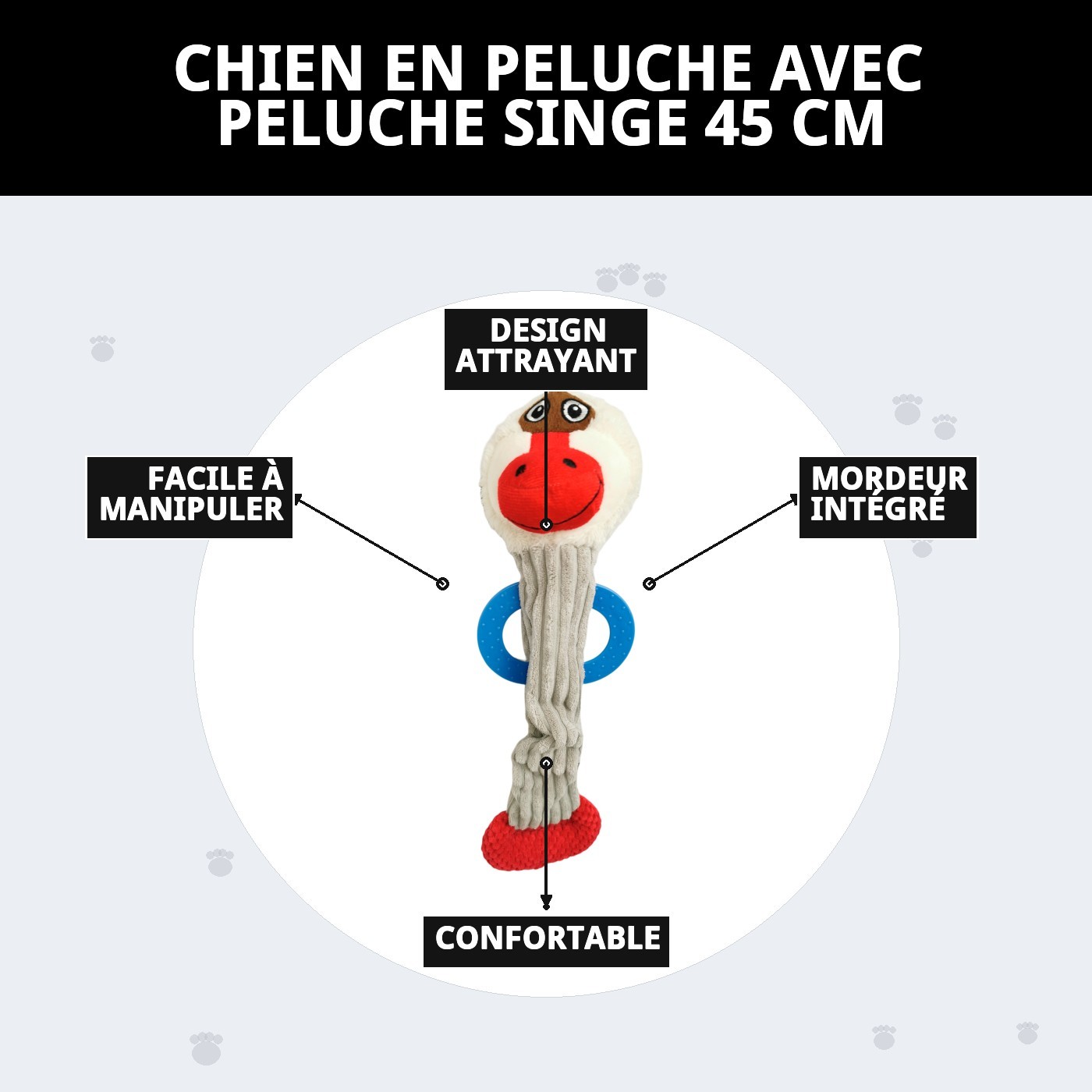 Le peluche chien avec mordeur singe 45 cm est le compagnon idéal pour votre animal de compagnie. Son design doux et amusant attirera non seulement son attention, mais lui offrira également des heures de divertissement. De plus, le mordeur intégré favorise la santé dentaire de votre chien tout en jouant. Offrez-lui une journée spéciale !