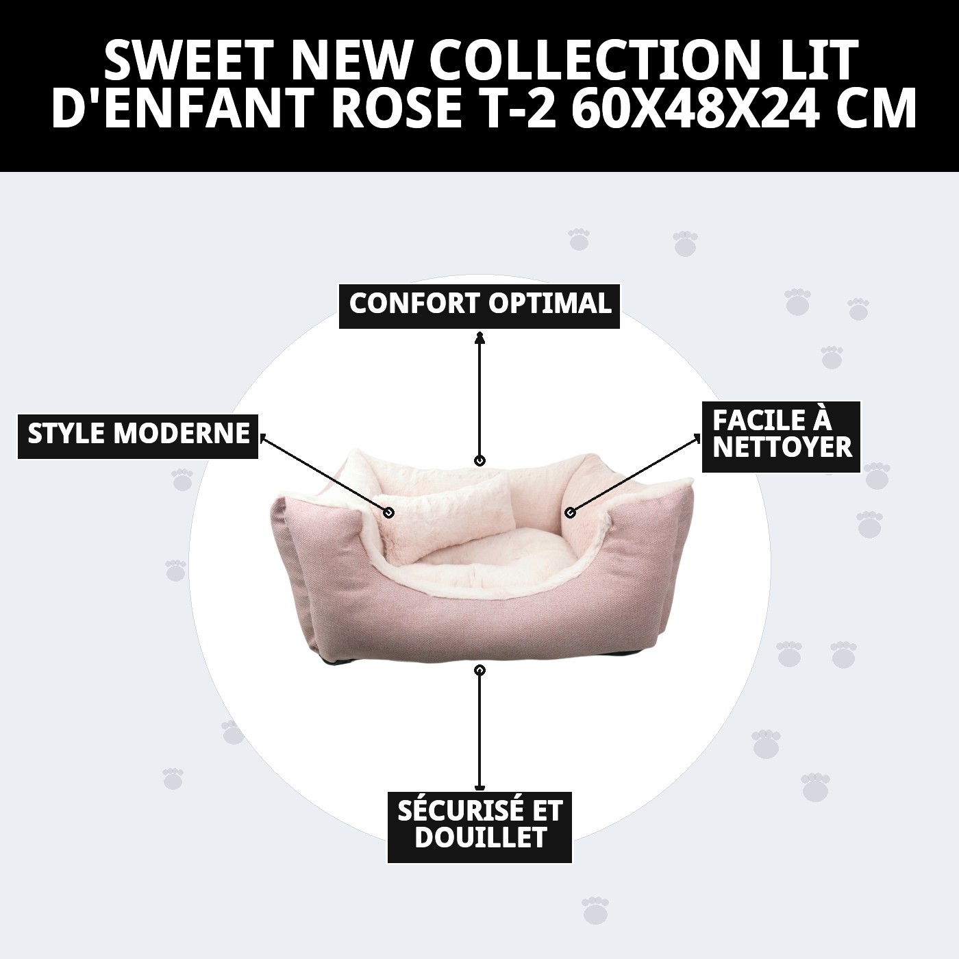 La NOUVELLE COLLECTION DULCE LIT ROSE T-2 60X48X24 CM est le refuge parfait pour votre animal de compagnie, alliant style et confort. Fabriqué avec des matériaux de haute qualité, il offre un espace accueillant et sécurisé où votre compagnon à quatre pattes pourra se reposer et rêver. Offrez à votre ami un endroit spécial qu'il adorera.