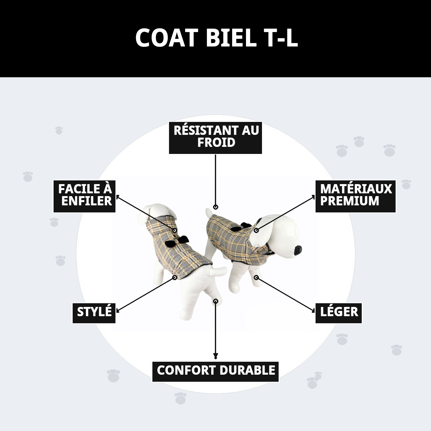 Le manteau Biel T-L est le vêtement idéal pour garder votre animal de compagnie au chaud et à l'aise lors des journées froides. Avec son design élégant et ses matériaux de haute qualité, votre compagnon à fourrure sera à la fois stylé et protégé du froid. De plus, son ajustement facile garantit que votre fidèle ami se sente bien en tout temps.