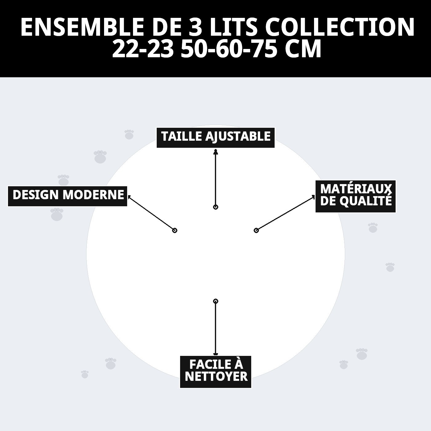 Le jeu de 3 lits pour animaux de compagnie de la collection 22-23 est parfait pour offrir à vos amis à fourrure un espace confortable et sécurisé. Avec des dimensions de 50, 60 et 75 cm, il s'adapte parfaitement aux chiens et aux chats de différentes tailles. De plus, son design élégant complétera la décoration de votre maison, transformant n'importe quel coin en un endroit accueillant pour le repos de vos animaux de compagnie.