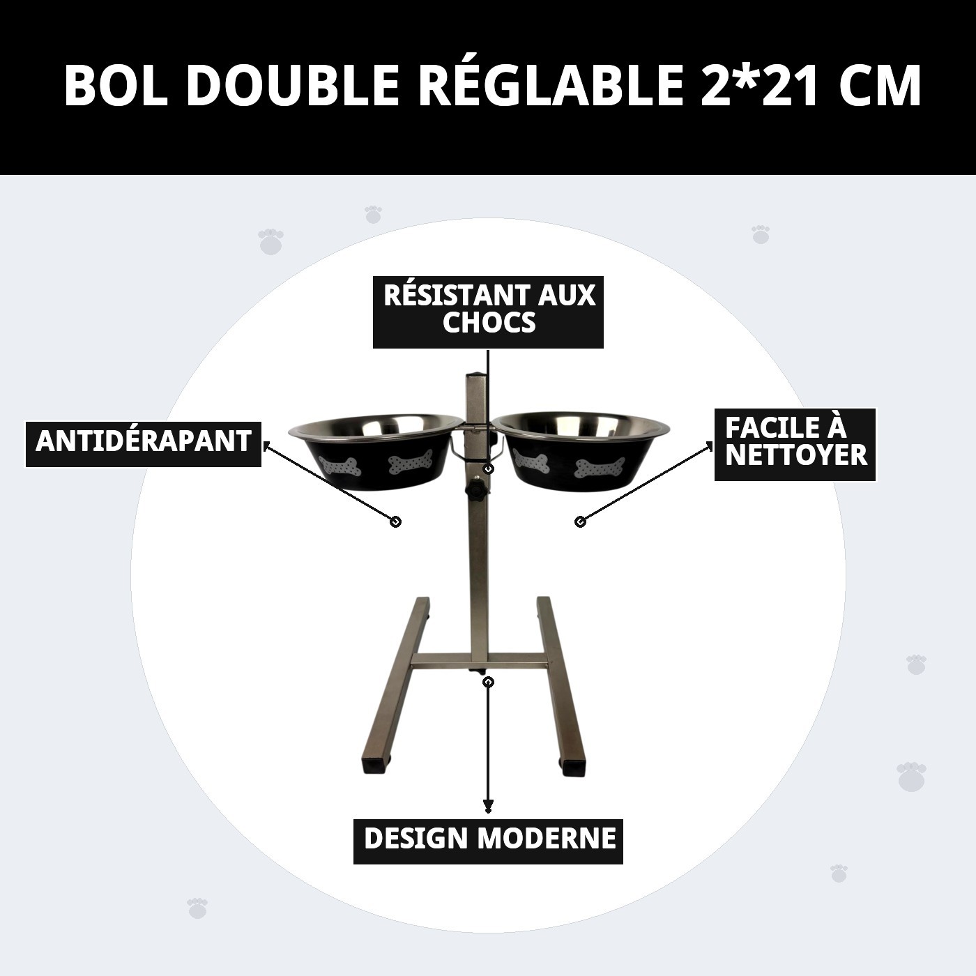 Gamelle double ajustable pour chiens, hauteur maximale de 43 cm, avec deux récipients au design idéal pour les chiens souffrant d'arthrite ou les chiens âgés ayant une mobilité réduite. Grâce à cette gamelle, vos animaux n'ont plus besoin de pencher le cou, ce qui leur permet de manger et de boire plus facilement, tout en évitant les déversements de nourriture et d'eau, maintenant ainsi votre espace propre. La base en forme de H est en métal zincé foncé, tandis que les récipients en acier inoxydable affichent un design extérieur moderne avec des motifs d'os. Ce support avec gamelles en acier est parfait, surtout pour les chiens âgés et les grands chiens ayant des problèmes de mobilité.