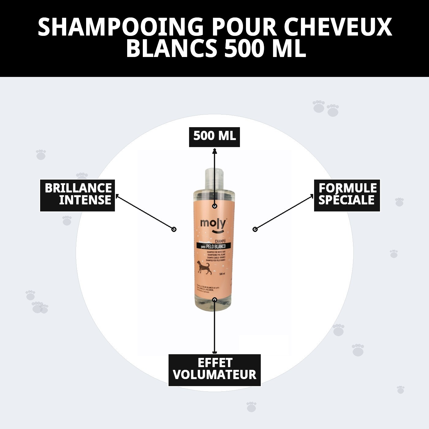 Shampoing pour poils blancs de 500 ml, spécialement conçu pour les animaux à pelage blanc. Ce produit ravive la couleur blanche du pelage, apportant brillance et volume qui facilitent le coiffage. Son pH neutre garantit qu'il n'irrite pas la peau de votre animal, offrant un soin respectueux et efficace.
