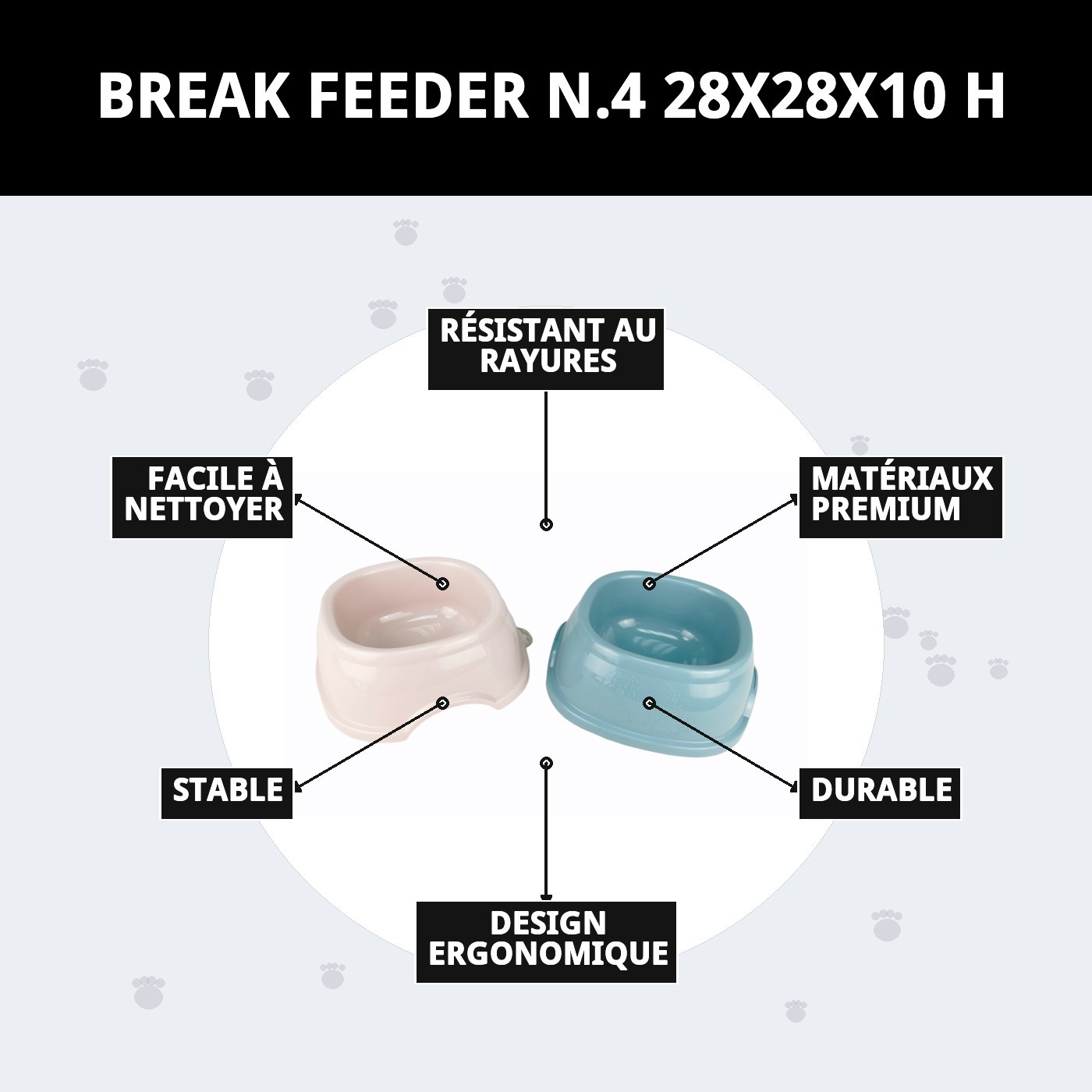 Le bol Break N.4 se distingue par son design pensé pour faciliter l'alimentation de votre animal. Avec des dimensions de 28x28x10 cm, il est idéal pour les chiens et les chats de petite à moyenne taille. La hauteur est parfaite pour que votre compagnon puisse manger confortablement, évitant des postures inconfortables qui peuvent à long terme causer des problèmes de santé.