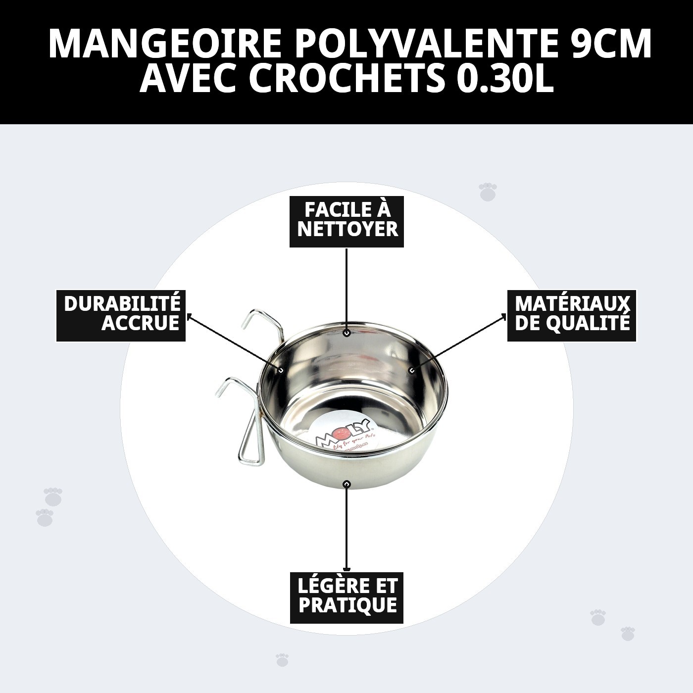 Découvrez le bol multi-usages 9cm avec crochets, idéal pour vos animaux de compagnie. Avec un diamètre de 9 cm et une capacité de 0,30 L, il est parfait pour l'alimentation des chiens et des chats. Son design pratique et fonctionnel, ainsi que les crochets inclus, vous permettent de le maintenir en place, évitant ainsi les renversements. Rendez les heures de repas plus agréables !