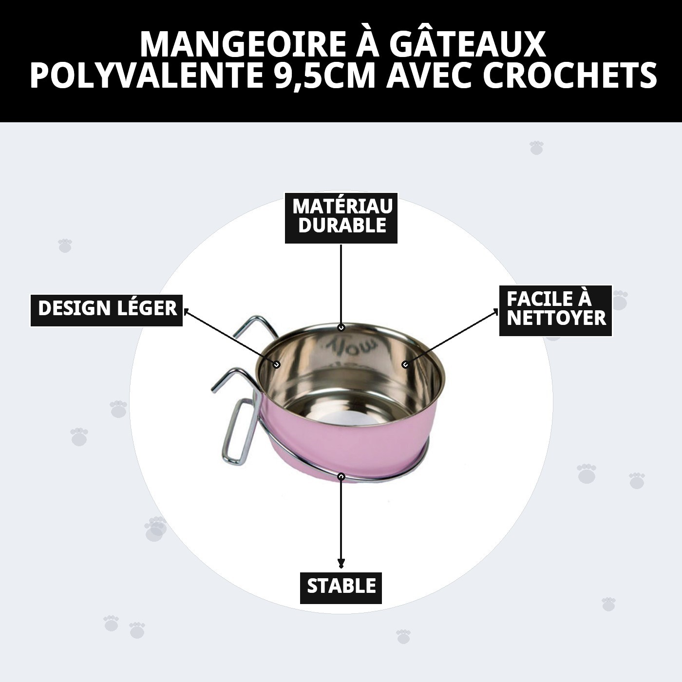 Découvrez le bol multifonction Cake 9,5 cm avec crochets, idéal pour faciliter l'alimentation de votre animal de compagnie. Son design polyvalent s'adapte à divers besoins, garantissant une expérience pratique et confortable. Avec des crochets qui assurent la stabilité, ce bol est parfait pour tout type d'animal. Transformez chaque repas en un moment spécial !