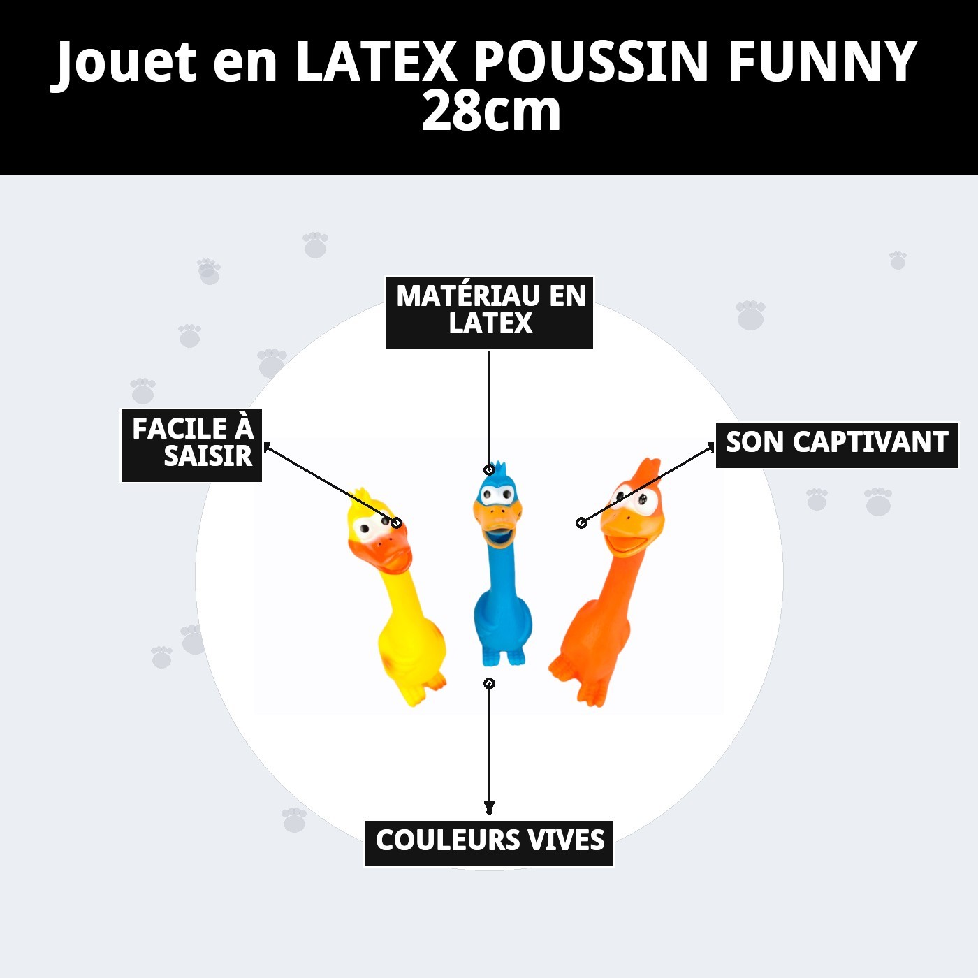 Le jouet en latex poulet drôle 28 cm est le compagnon idéal pour votre chien. Avec sa forme amusante et son son captivant, ce jouet gardera votre animal diverti pendant des heures, tout en exerçant sa musculature et en satisfaisant son instinct de mordre. Disponible en trois couleurs vibrantes, il fera en sorte que votre compagnon à quatre pattes s'amuse au maximum !