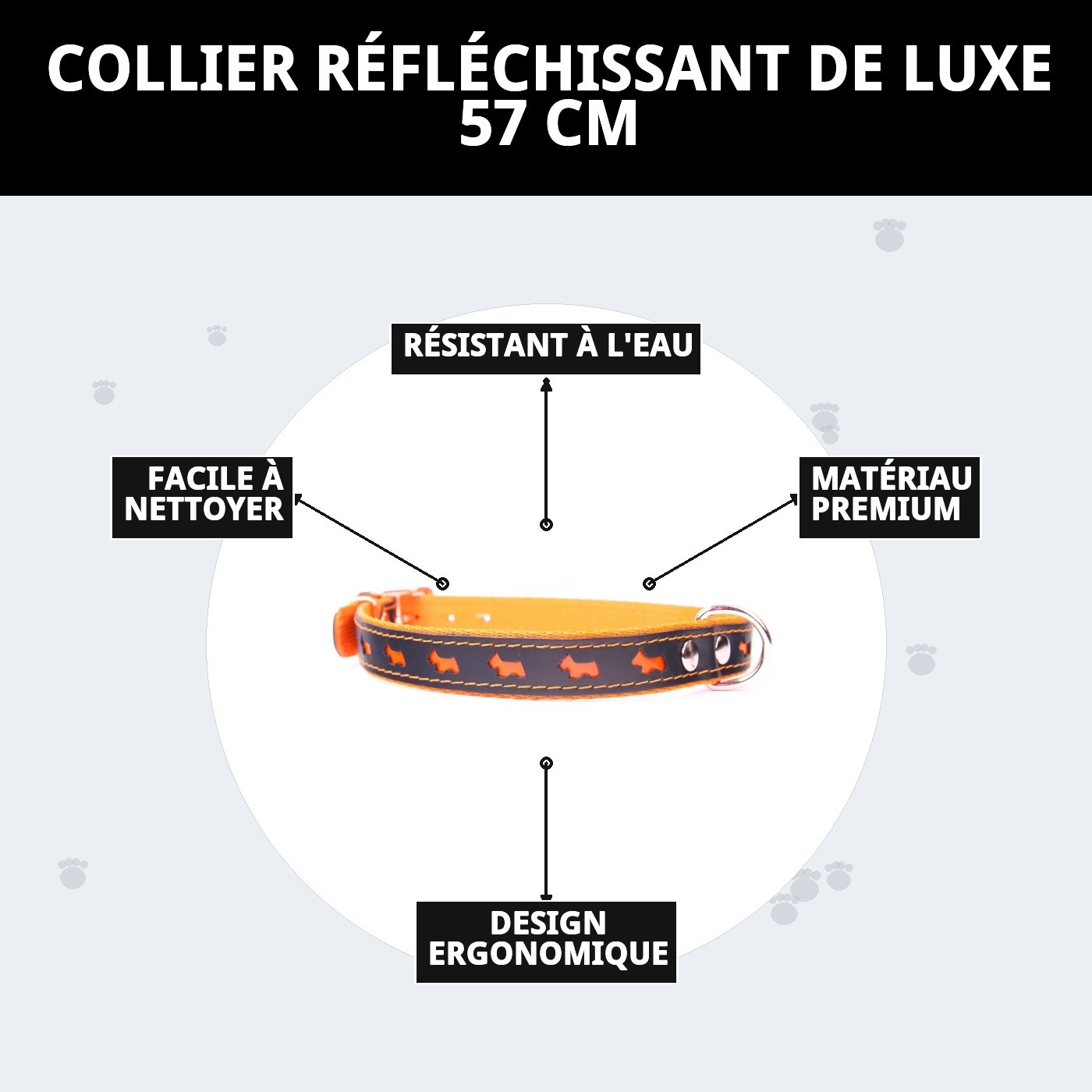 Découvrez le collier luxury réfléchissant 57 cm, une option parfaite pour promener votre animal avec style et sécurité. Fabriqué en cuir de haute qualité et dans une couleur orange réfléchissante vibrante, il garantit une visibilité dans l'obscurité. Offrez à votre compagnon à quatre pattes une touche d'élégance et de protection.