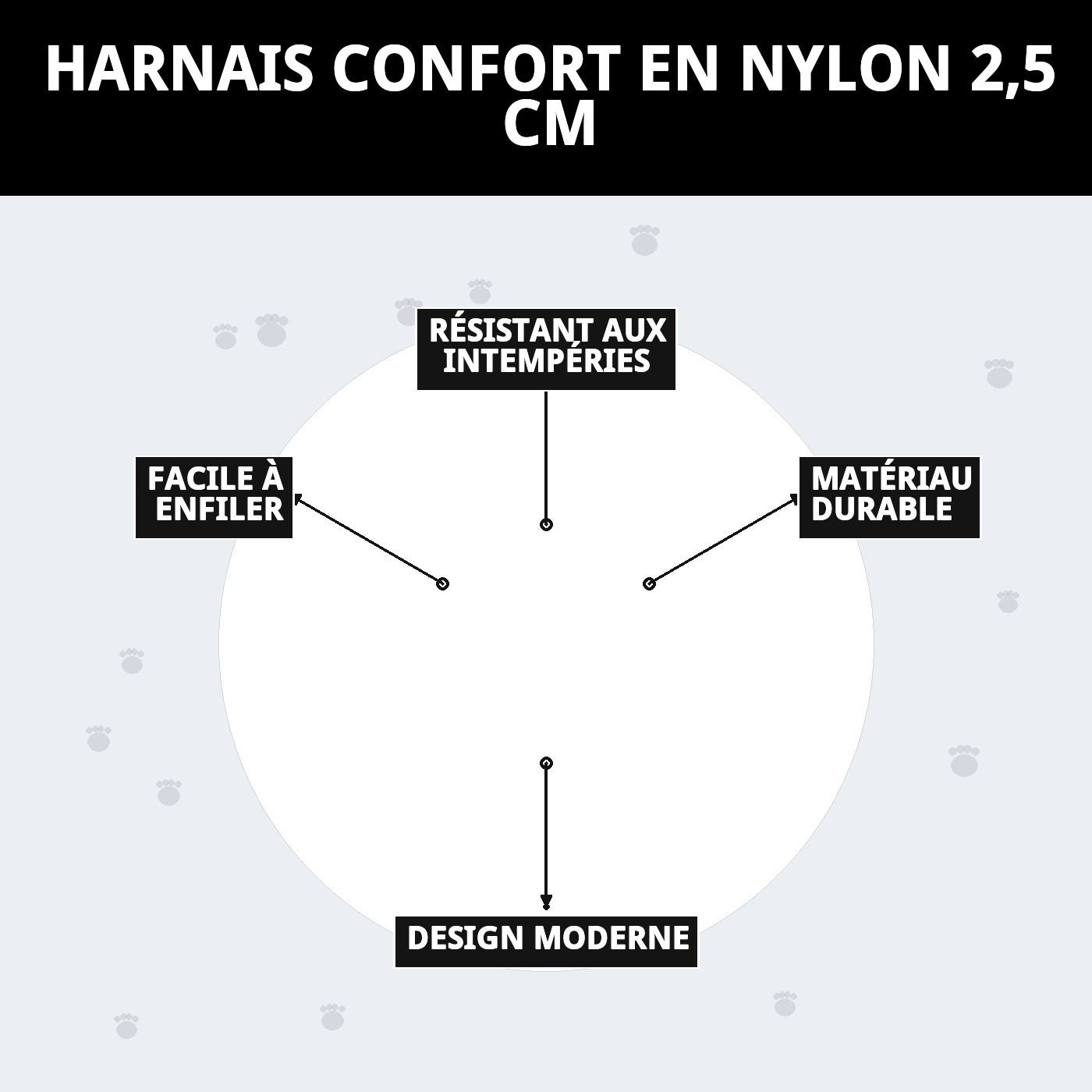 Découvrez le harnais en nylon confort 2,5 cm, conçu pour offrir un maximum de confort à votre chien. Avec son rembourrage doux et résistant, ce harnais est parfait pour les longues promenades. Disponible en 4 couleurs, il allie style et fonctionnalité. Choisissez le meilleur pour votre ami à quatre pattes et profitez d'aventures inoubliables ensemble !