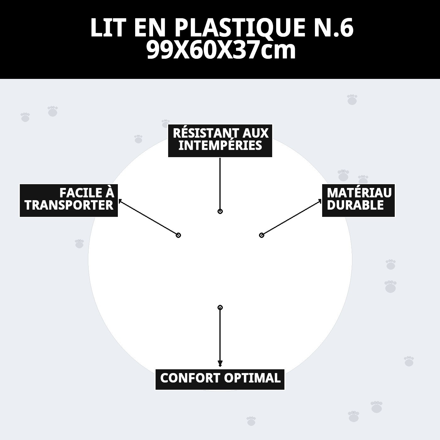Le lit en plastique N.6 a été conçu avec des dimensions de 99x60x37 cm, ce qui en fait une option parfaite pour les chiens de taille moyenne ou même les chats à la recherche d'un espace douillet. Le meilleur de tout, c'est que sa structure en plastique la rend résistante et facile à nettoyer. Oubliez les soucis de taches ou de mauvaises odeurs, un simple chiffon humide suffit pour la garder impeccable.