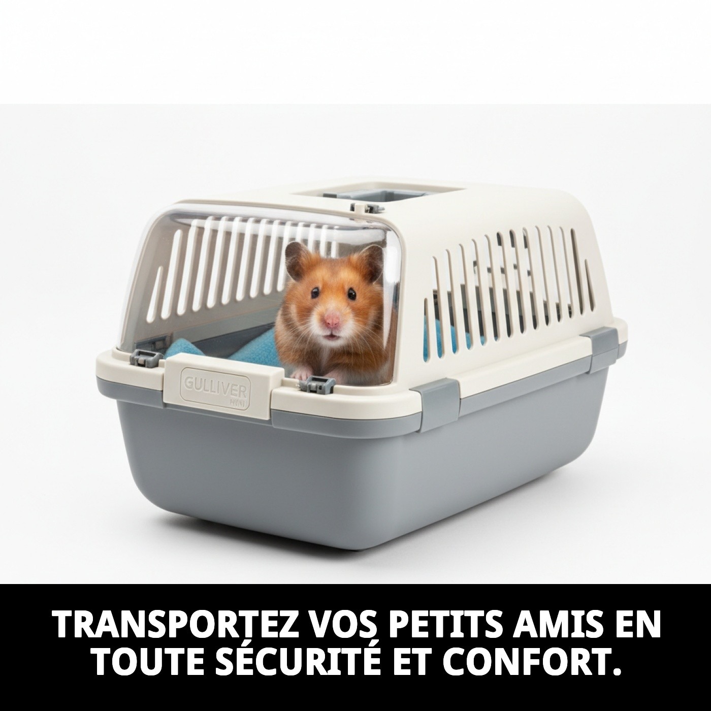 Le transporteur mini Gulliver est parfait pour emmener vos petits amis, comme les cobayes, les hamsters ou les lapins, en toute sécurité et confort. Avec des dimensions de 40x30x24 cm, il offre une excellente ventilation, un système de fermeture sécurisé et un toit transparent qui permet une visibilité optimale. Emmenez-les avec vous sans souci !
