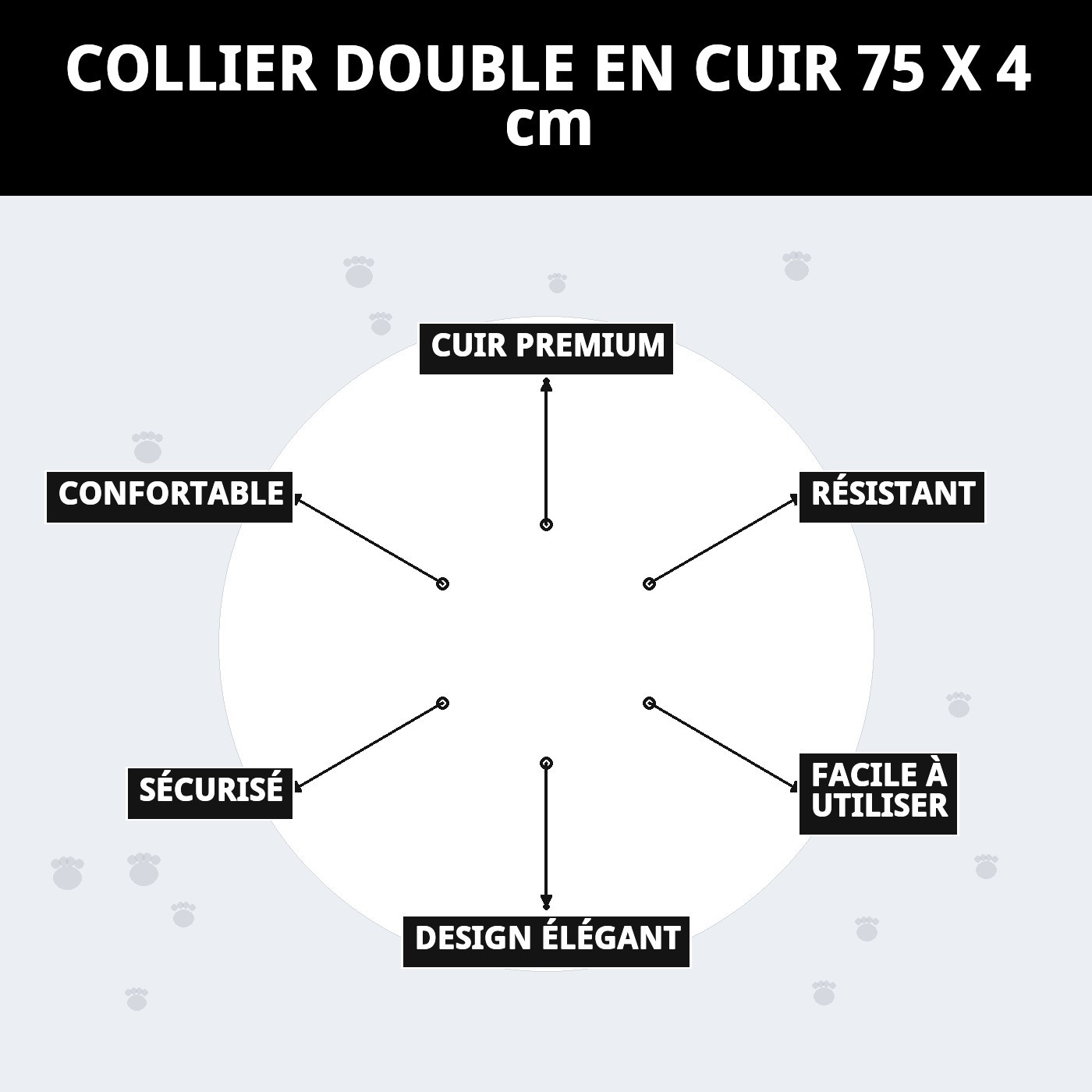 Le collier en cuir double 75 x 4 cm est le choix parfait pour votre animal de compagnie, alliant style et confort. Fabriqué en cuir de haute qualité, il garantit durabilité et résistance, tout en offrant un design élégant. Idéal pour les promenades, ce collier s'ajuste parfaitement et assure la sécurité de votre chien.