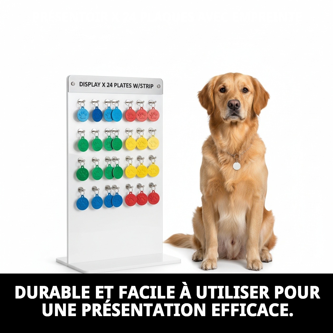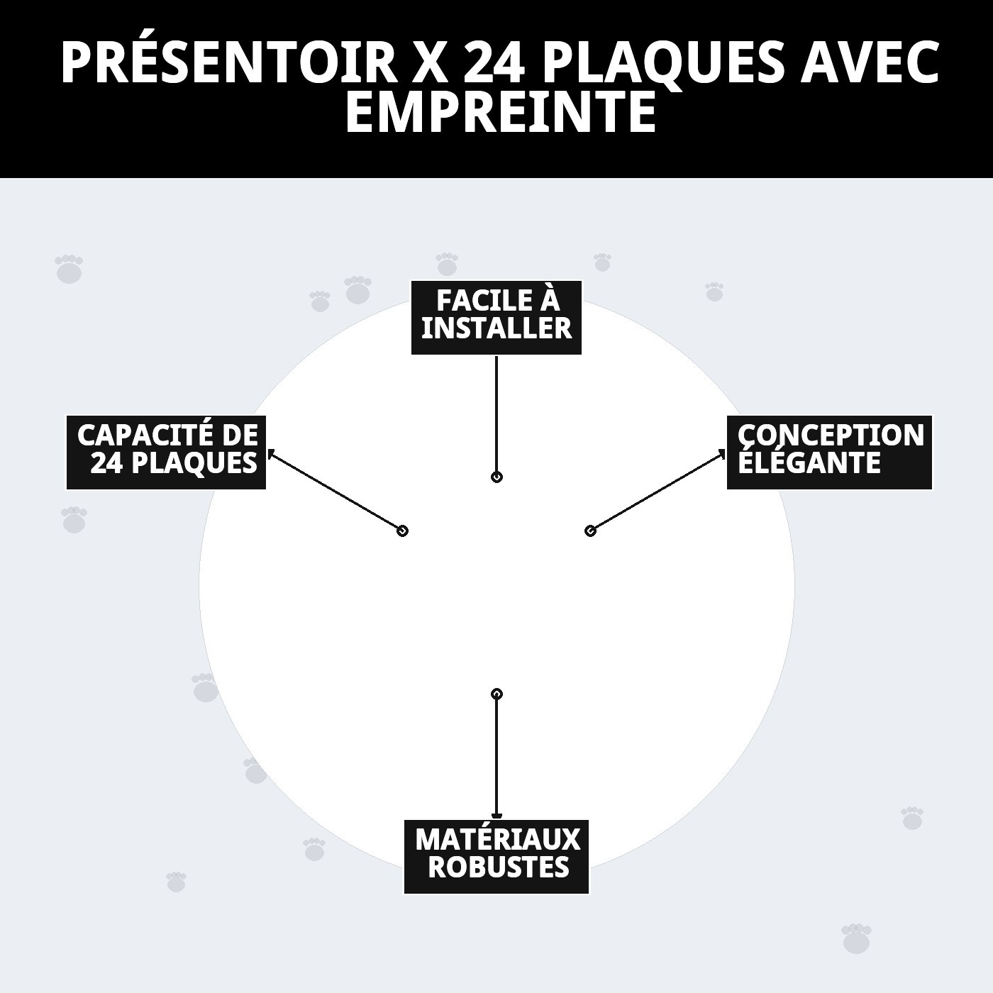 L'exposant x 24 plaques c/h empreinte est un complément idéal pour toute boutique d'animaux cherchant à offrir des produits de qualité et au design attrayant. Cet exposant peut montrer jusqu'à 24 plaques, ce qui signifie que vous aurez un large choix pour que vos clients trouvent celle qui convient le mieux à leurs animaux. De plus, son format est très pratique, permettant une visualisation facile des plaques.
