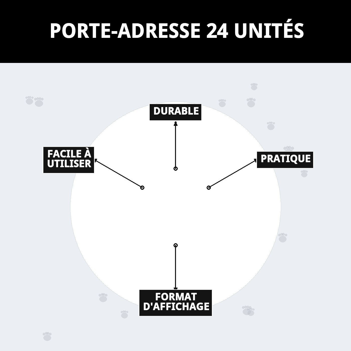 Le porte-adresses de 24 unités est la solution idéale pour organiser et étiqueter les objets de votre animal de compagnie. Avec un format d'exposition, cet accessoire est à la fois pratique et fonctionnel, garantissant que vous ne perdrez jamais l'adresse de vos affaires. Facilitez l'identification de manière simple et efficace !