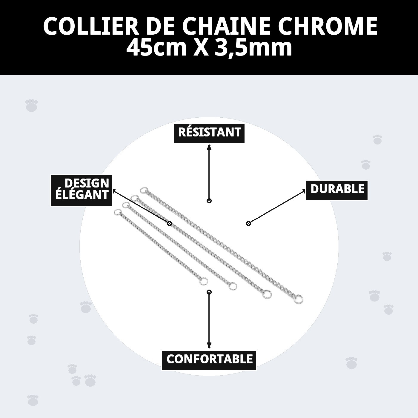 Si vous recherchez un collier résistant, durable et élégant, le collier chaîne chromée 45cm x 3,5mm est une option à ne pas manquer. Vous offrirez non seulement sécurité et contrôle à votre animal, mais vous le ferez également briller à chaque promenade. N'hésitez pas à en acquérir un et à profiter d'aventures inoubliables avec votre ami à quatre pattes !
