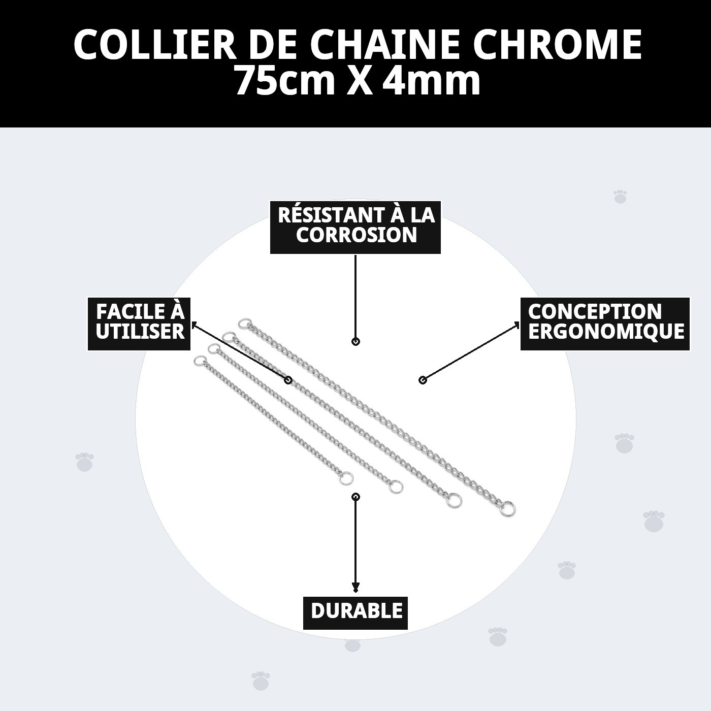 Si vous recherchez un collier qui aide dans le processus d'entraînement, le collier chaîne chromée est un excellent choix. Ce type de collier permet au propriétaire d'avoir un meilleur contrôle sur le chien, ce qui est particulièrement utile lors des promenades ou dans des situations où le comportement du chien doit être corrigé.