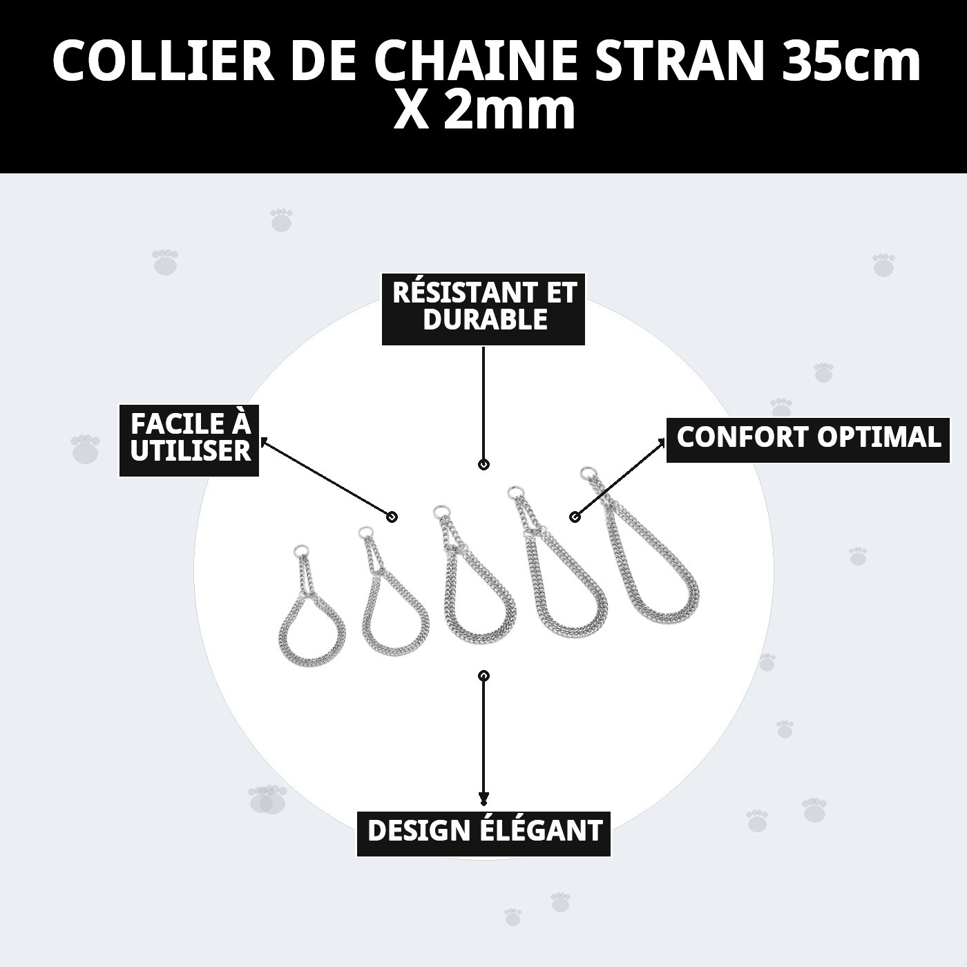 Les colliers étrangleurs sont un outil d'entraînement très utilisé par les éducateurs canins et les propriétaires d'animaux. Leur conception permet de corriger rapidement et efficacement les comportements indésirables. Cependant, il est essentiel de les utiliser de manière responsable et avec les connaissances appropriées. La chaîne de 35 cm et 2 mm est idéale pour les chiens de petite à moyenne taille, offrant un ajustement confortable et sécurisé.
