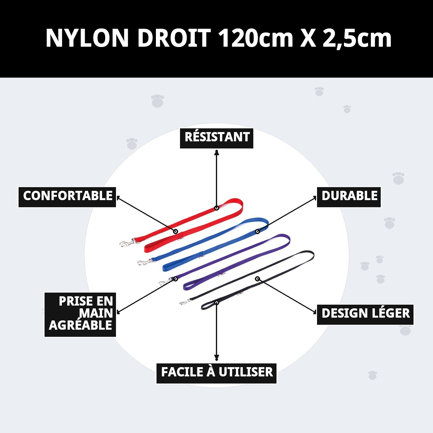 Parlons un peu plus des caractéristiques de cette laisse. Avec des dimensions de 120 cm de long et 2,5 cm de large, cette laisse est parfaite pour offrir le contrôle nécessaire sans sacrifier le confort de votre animal. Le choix du nylon comme matériau principal en fait un accessoire très durable et résistant.