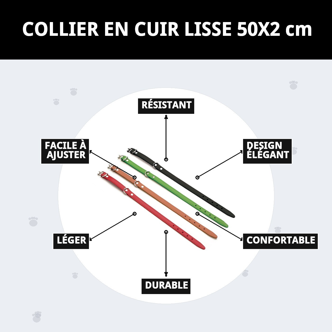 Le collier en cuir lisse 50x2 cm est conçu avec un matériau de haute qualité qui garantit durabilité. Son format de 50x2 cm le rend idéal pour les animaux de taille moyenne, assurant un ajustement confortable sans causer d'inconfort. De plus, son design lisse permet un nettoyage facile, ce qui est toujours un plus lorsqu'il s'agit d'accessoires pour animaux.