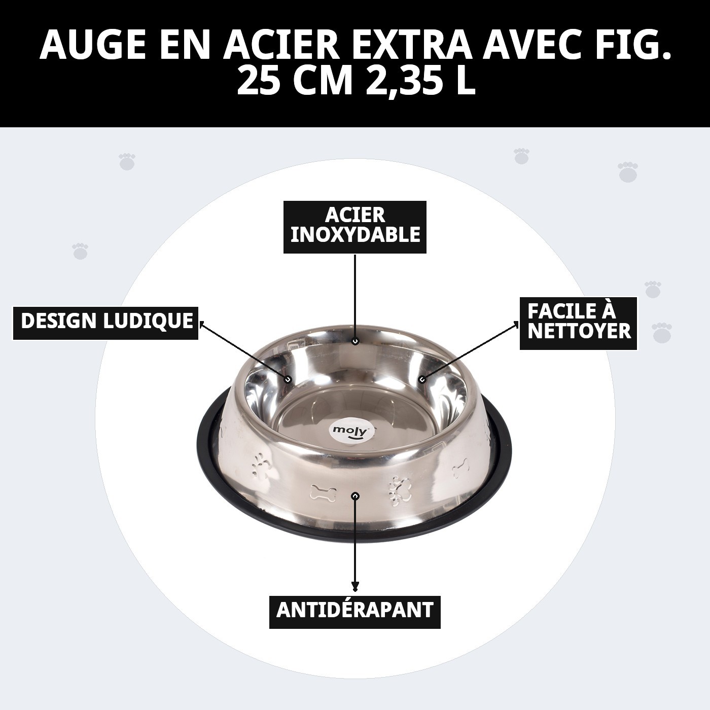 Le bol en acier inoxydable de 25 cm et 2,35 L est parfait pour votre animal de compagnie. Avec un design découpé présentant des petites formes d'os et d'empreintes, il ajoute une touche ludique à l'heure du repas. Sa base en caoutchouc amovible facilite non seulement le nettoyage, mais offre également une adhérence antidérapante, garantissant que votre ami à fourrure profite de son repas sans souci.