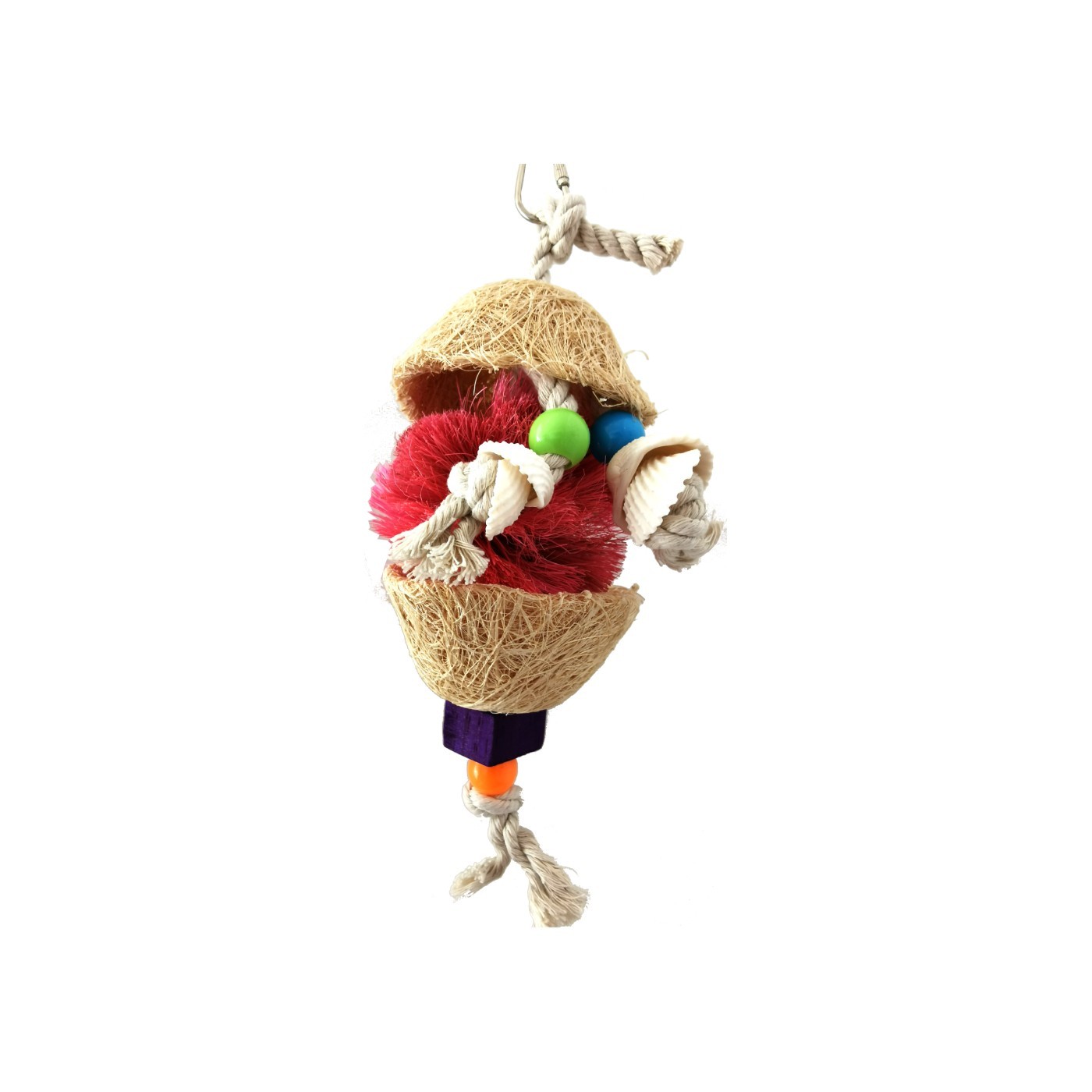 Un des principaux avantages de ce jouet est qu'il favorise la stimulation mentale. Les oiseaux sont naturellement curieux et adorent découvrir de nouvelles choses. En interagissant avec le jouet, votre oiseau sera motivé à picorer, grimper et jouer, ce qui l'aidera également à maintenir un poids sain. La combinaison de fibres naturelles et de coquillages crée un environnement attrayant qui stimule sa curiosité et l'encourage à explorer. N'est-ce pas génial de pouvoir contribuer au bonheur de votre petit oiseau de cette manière ?