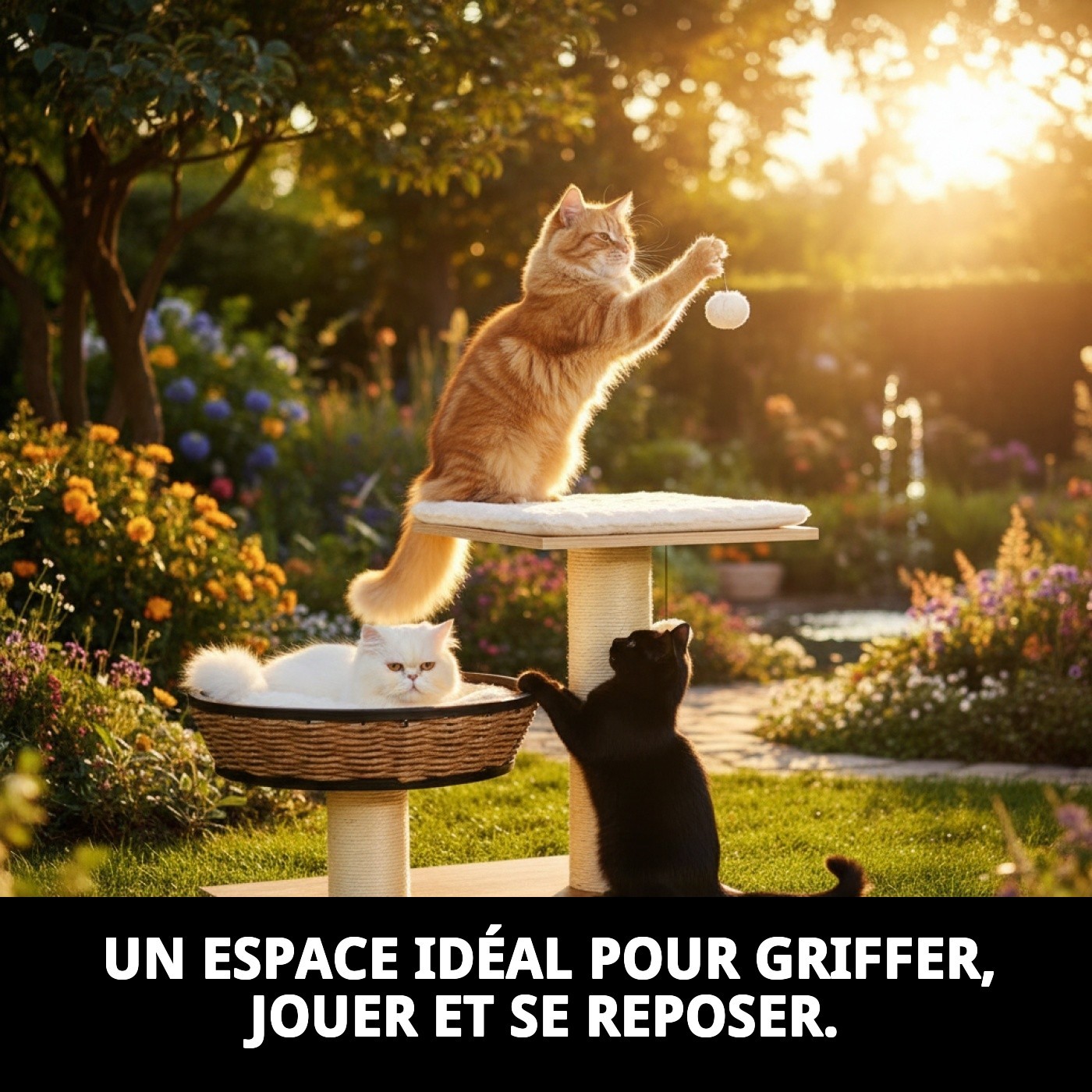 Une des caractéristiques les plus remarquables de ce grattoir est sa zone de repos. En haut, ton chat trouvera un espace confortable pour se détendre après une intense séance de jeux. Souvent, j'ai vu mon chat blotti là, profitant du soleil qui entre par la fenêtre. C'est un endroit parfait pour qu'il se sente en sécurité et à l'aise.