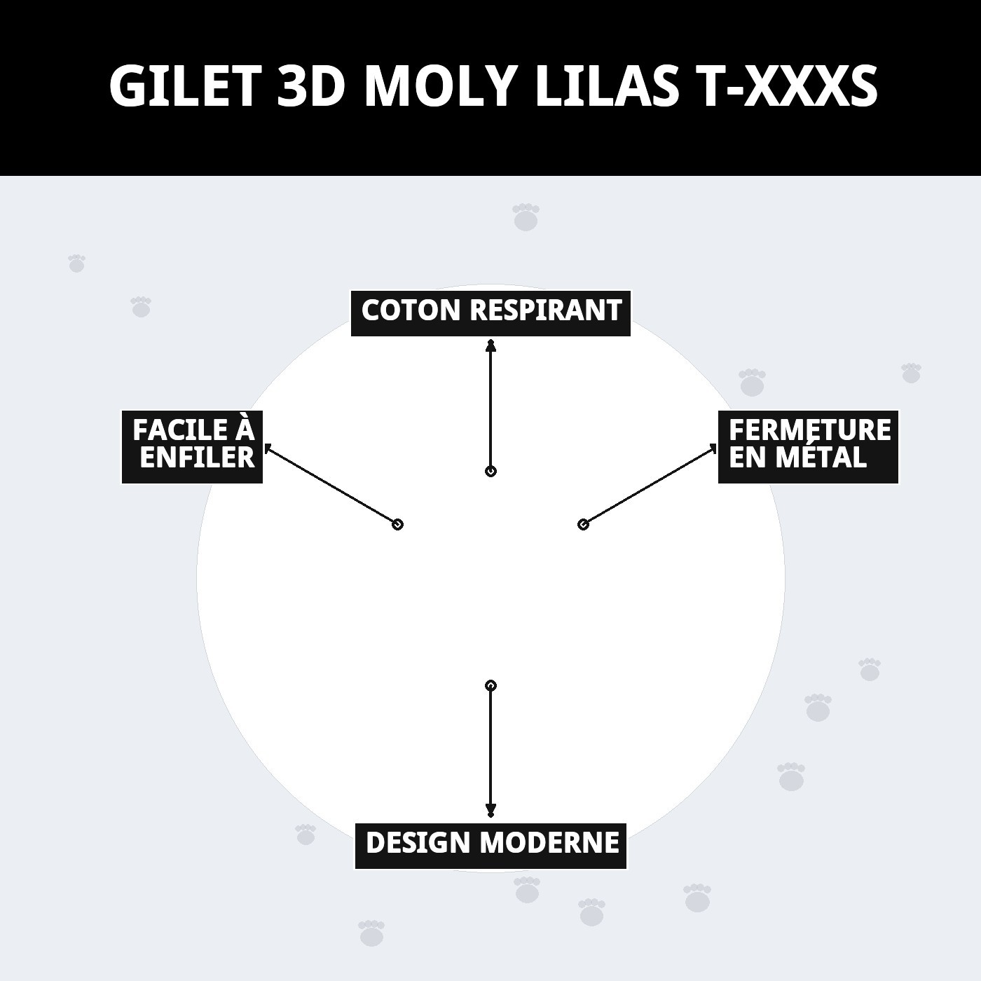 Le gilet 3D Moly lilas T-XXXS est le choix parfait pour votre animal de compagnie. Fabriqué en coton respirant, il s'adapte à sa température et à ses besoins, garantissant son confort. Sa fermeture métallique offre une sécurité supplémentaire, permettant à votre compagnon de profiter de ses promenades en toute tranquillité et avec style.