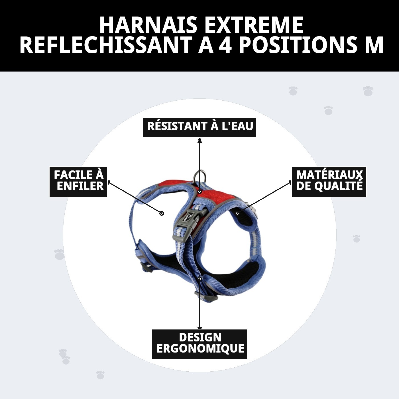 Découvrez le **harnais extrême réfléchissant avec 4 positions M**, parfait pour les promenades nocturnes. Son design réfléchissant assure la sécurité de votre animal dans l'obscurité, tandis que les quatre positions permettent un ajustement parfait et confortable. Avec ce harnais, vos promenades seront plus sûres et agréables.