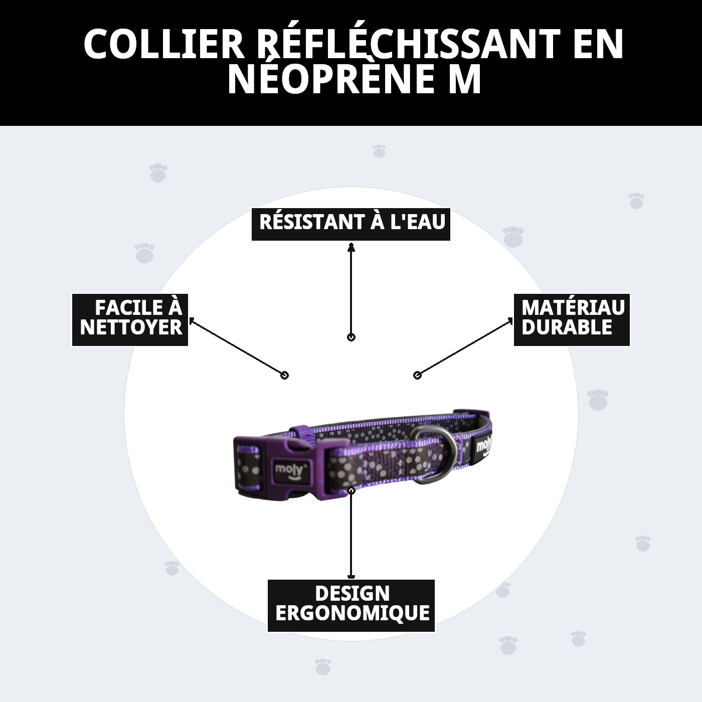 Le collier en néoprène réfléchissant M est fabriqué avec des matériaux de haute qualité qui garantissent durabilité et confort. Son design en néoprène le rend non seulement résistant à l'eau, mais il offre également une douceur qui évite les irritations sur la peau de votre animal. C'est parfait pour ces jours de pluie ou pour les chiens qui s'amusent dans l'eau !
