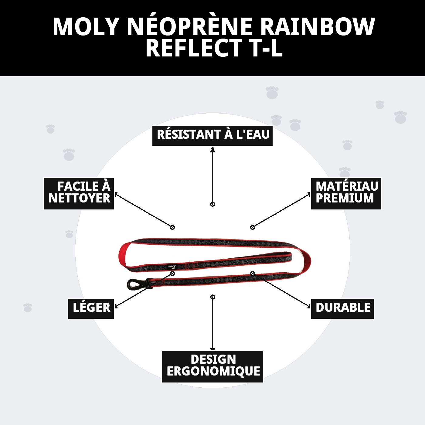 Le laisse Moly néoprène Rainbow Reflect T-L est un excellent choix pour ceux qui recherchent un produit alliant style, confort et sécurité. Ne manquez pas l'occasion d'améliorer vos promenades et de faire de chaque sortie une aventure mémorable. Votre chien mérite le meilleur !