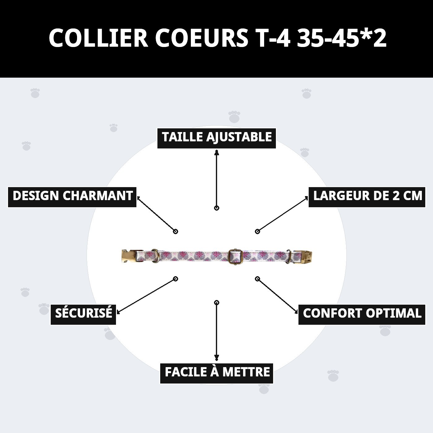 Le collier cœurs T-4 est parfait pour que votre animal de compagnie soit à la fois charmant et à la mode. Avec une taille ajustable de 35 à 45 cm et une largeur de 2 cm, ce collier allie confort et style, devenant l'accessoire idéal pour les promenades et les aventures. Offrez à votre compagnon à quatre pattes une touche unique !