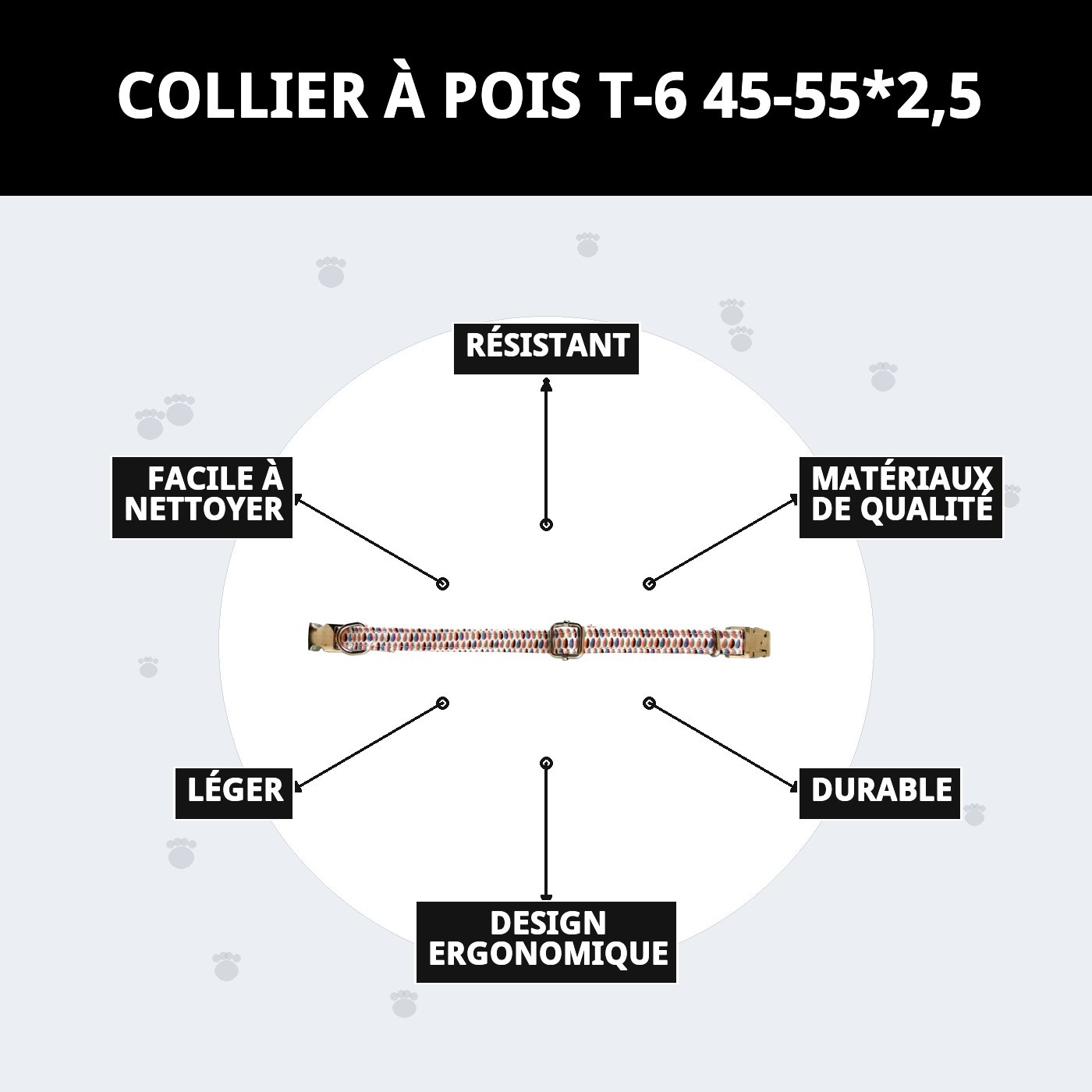 Le collier à pois T-6 est le choix parfait pour votre animal de compagnie, avec des mesures de 45-55 cm et une largeur de 2,5 cm. Son design joyeux et moderne apporte non seulement du style, mais garantit également confort et sécurité. Faites en sorte que votre compagnon à quatre pattes ait fière allure lors de vos promenades ensemble !