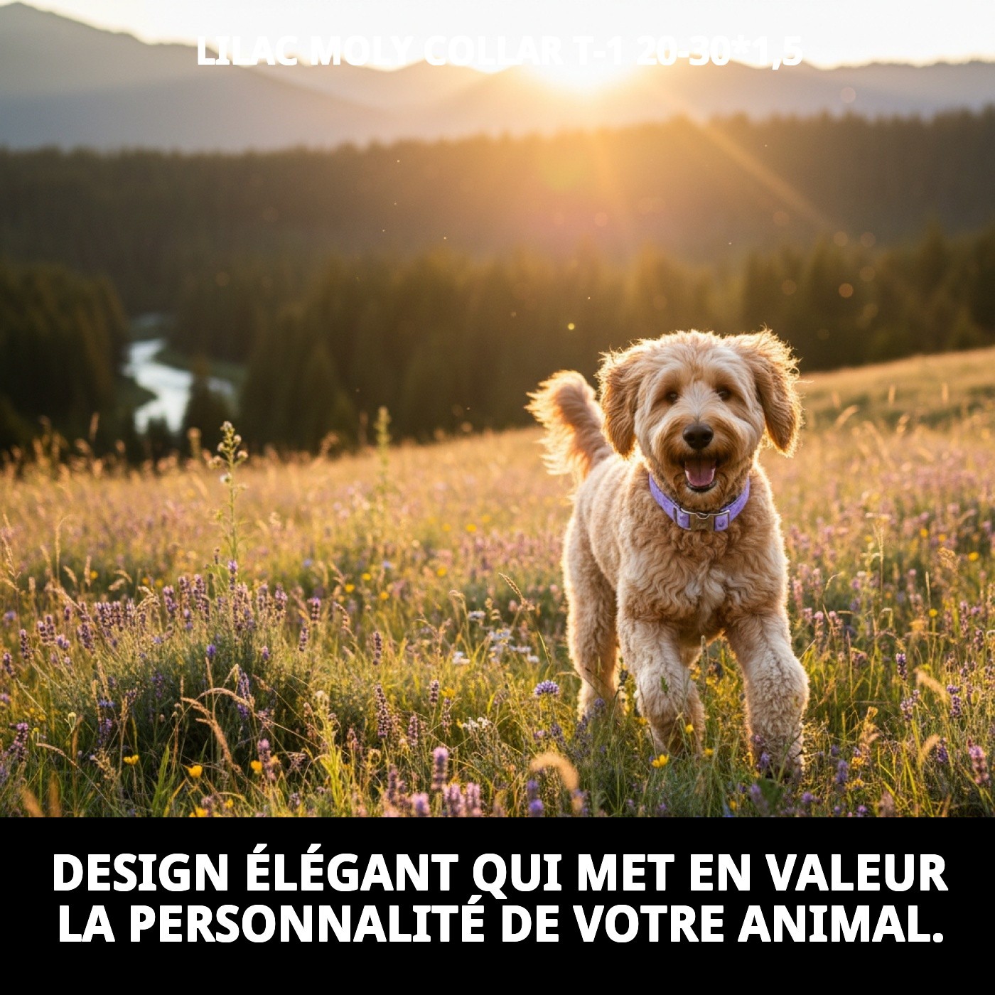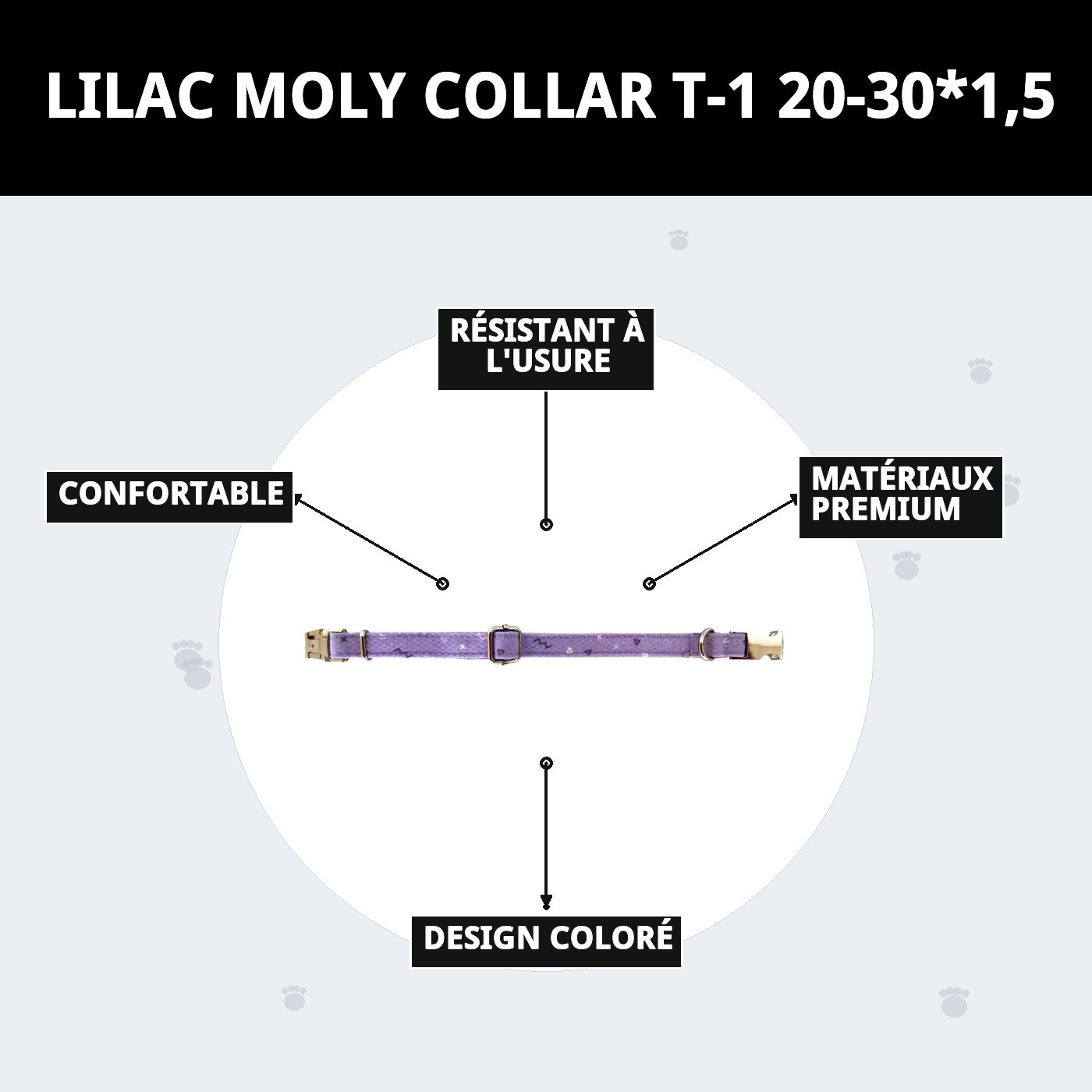 Le collier Moly lilas est conçu pour offrir un maximum de confort et de sécurité. Sa taille T-1 s'adapte parfaitement aux chiens ayant un cou de 20 à 30 cm, ce qui le rend idéal pour les races petites et moyennes. La mesure de 1,5 cm de large assure un maintien adéquat sans être trop lourd.