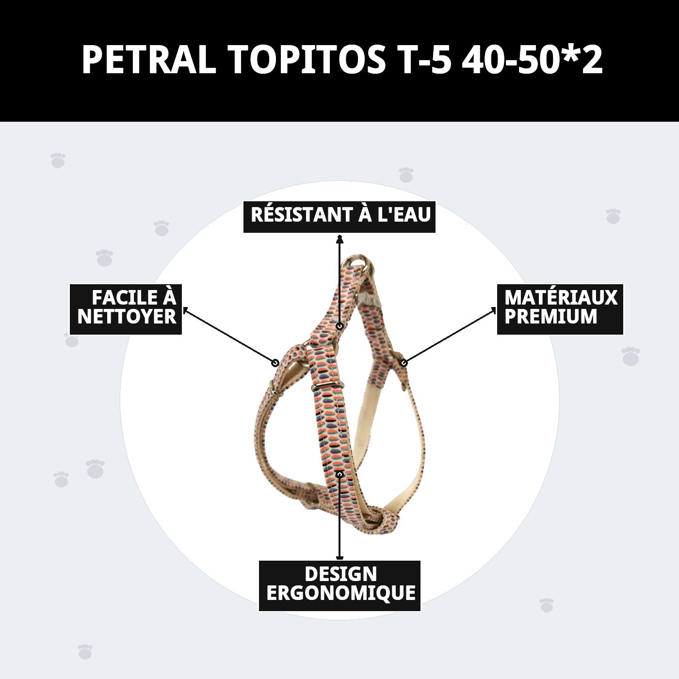 Qui a dit que la fonctionnalité ne peut pas aller de pair avec le style ? Le petral topitos T-5 est disponible dans une variété de couleurs et de motifs qui s'adapteront sûrement à la personnalité de votre animal. Des tons classiques aux designs plus audacieux, vous pourrez choisir celui qui vous plaît le plus. N'oubliez pas qu'un chien heureux se sent également bien habillé.