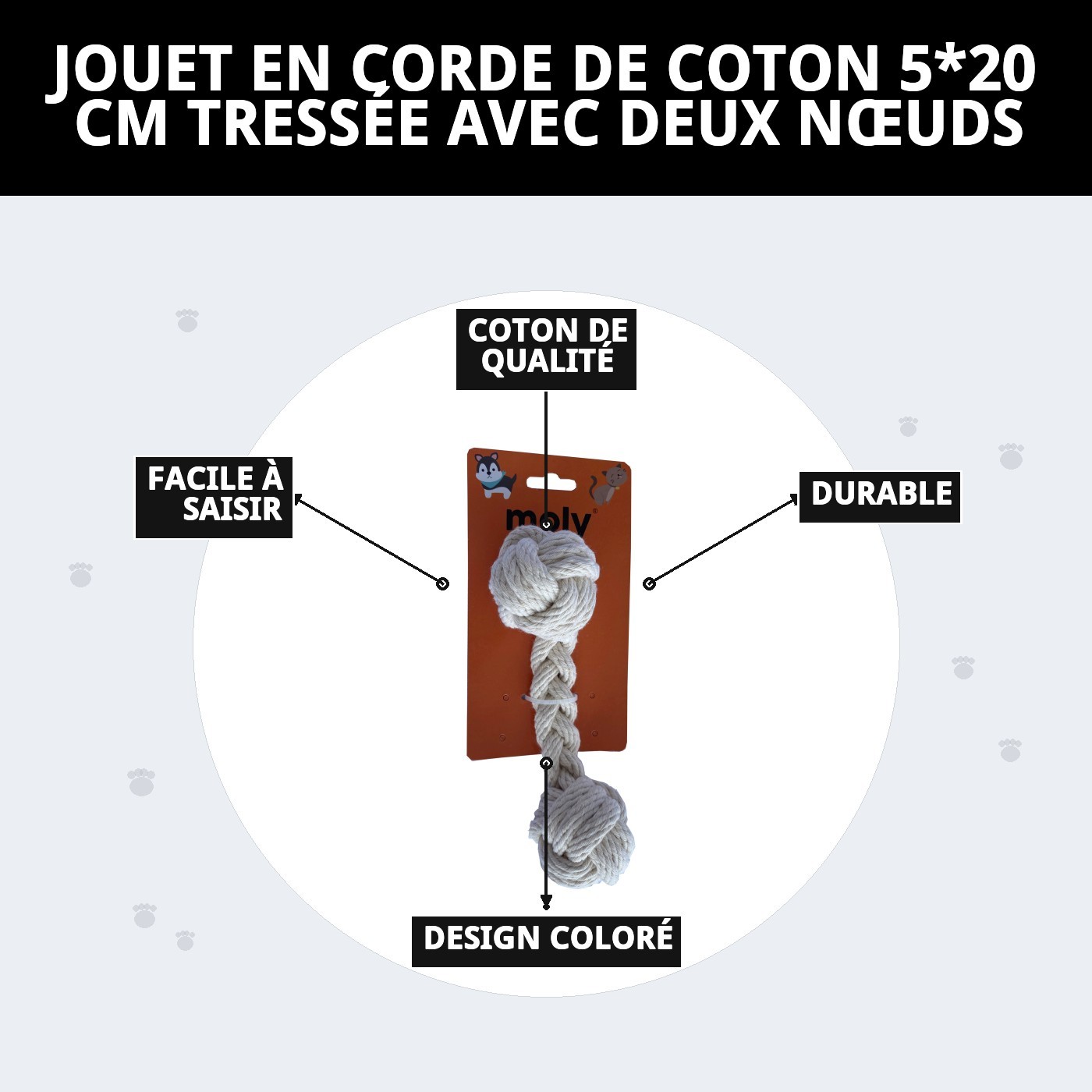 Le jouet en corde en coton 5*20 cm tressé avec deux nœuds de Moly est parfait pour garder votre chien diverti. Son design tressé et résistant offre des heures de plaisir tout en prenant soin de sa santé dentaire. Idéal pour jouer et mordiller, ce jouet deviendra rapidement son préféré à la maison.