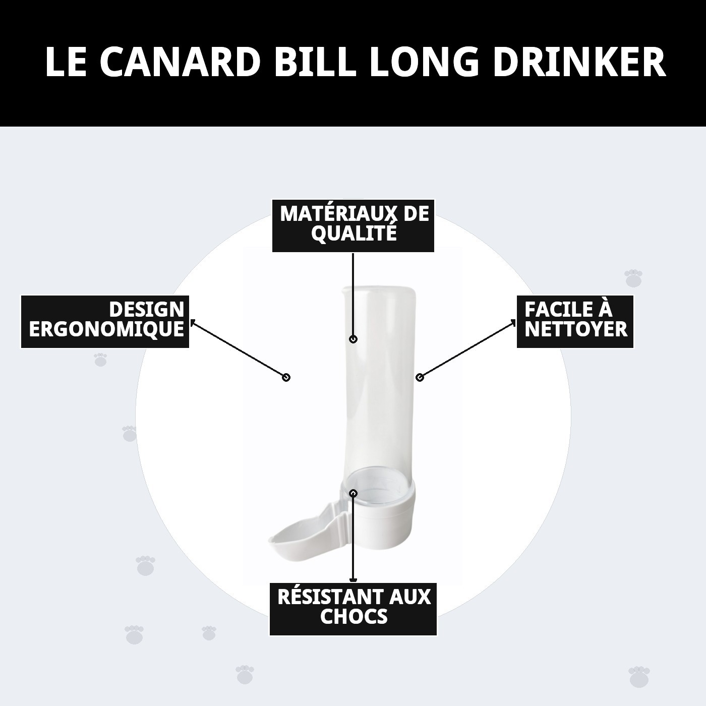 Le abreuvoir long bec canard est un accessoire idéal pour les cages, garantissant à vos oiseaux un accès constant à de l'eau fraîche. Son design pratique et fonctionnel facilite l'hydratation, évitant les déversements et maintenant l'environnement propre. Un choix indispensable pour le bien-être de vos animaux volants.